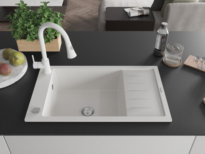 Technické dáta: drez: Rozmer: 795 x 480 x 200 mm Hĺbka komory: 190 mm Rozmery komory: 465×420 mm Priemer odtoku: ø90 mm Typ: 1-miska s krátkym odkvapkávačom Typ: Zapustené do pracovnej dosky biela farba Povrchová úprava sifónu: Chrome Materiál: žula (80% žulové kamenivo, 20% živice) Prepadový otvor: Áno Otvory: (batérie, automatické) 2 Inštalácia: Univerzálna, je možné inštalovať s odkvapkávačom na ľavú alebo pravú stranu Vysoká odolnosť proti poškriabaniu a zmene farby Odolnosť proti tepelným šokom Ľahko čistiteľný povrch Jeden dodatočný vyfrézovaný otvor na samodierovanie ø35 kuchynská batéria: Materiál: mosadz biela farba Hlava: Keramická Prevzdušňovač: Áno Typ: Jedna páka Výška batérie: 380 mm Rozsah výtoku: 252 mm Typ výtoku: Výsuvný(GT) Ean: 5905315029706