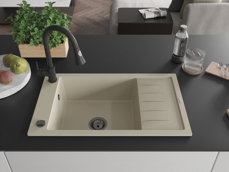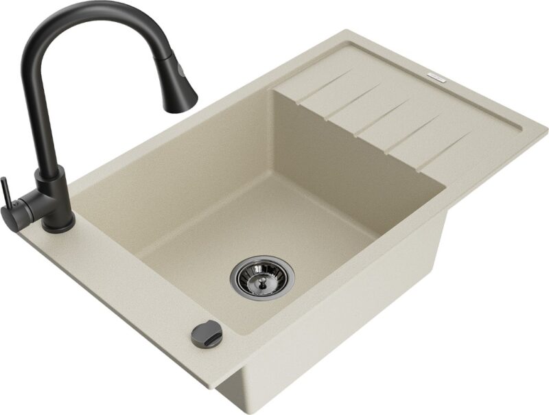 Technické dáta: drez: Rozmer: 795 x 480 x 200 mm Hĺbka komory: 190 mm Rozmery komory: 465×420 mm Priemer odtoku: ø90 mm Typ: 1-miska s krátkym odkvapkávačom Typ: Zapustené do pracovnej dosky Farba béžová Povrchová úprava sifónu: čierna Materiál: žula (80% žulové kamenivo, 20% živice) Prepadový otvor: Áno Otvory: (batérie, automatické) 2 Inštalácia: Univerzálna, je možné inštalovať s odkvapkávačom na ľavú alebo pravú stranu Vysoká odolnosť proti poškriabaniu a zmene farby Odolnosť proti tepelným šokom Ľahko čistiteľný povrch Jeden dodatočný vyfrézovaný otvor na samodierovanie ø35 kuchynská batéria: Materiál: mosadz Čierna farba Hlava: Keramická Prevzdušňovač: Áno Typ: Jedna páka Výška batérie: 380 mm Rozsah výtoku: 252 mm Typ výtoku: Výsuvný(GT) Ean: 5905315029768