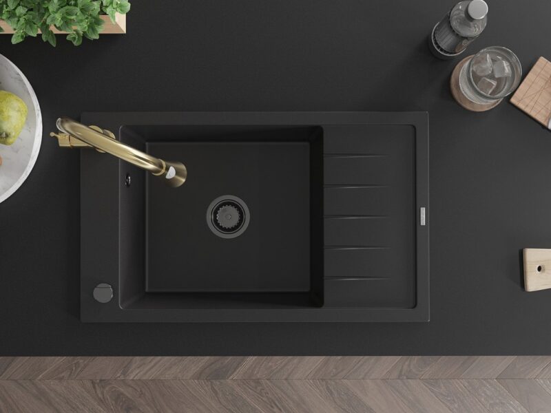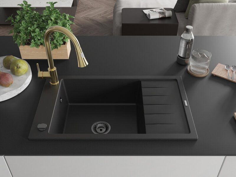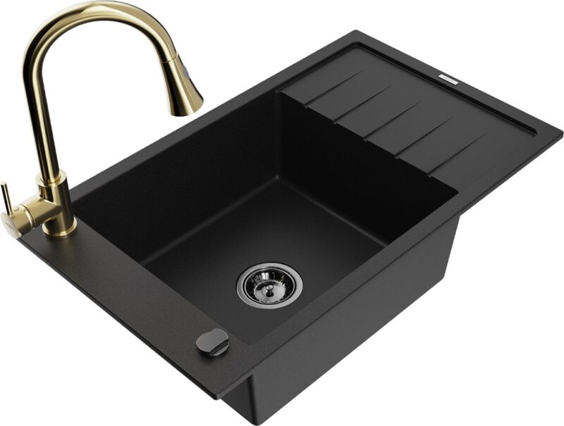Technické dáta: drez: Rozmer: 795 x 480 x 200 mm Hĺbka komory: 190 mm Rozmery komory: 465×420 mm Priemer odtoku: ø90 mm Typ: 1-miska s krátkym odkvapkávačom Typ: Zapustené do pracovnej dosky Čierna farba Povrchová úprava sifónu: čierna Materiál: žula (80% žulové kamenivo, 20% živice) Prepadový otvor: Áno Otvory: (batérie, automatické) 2 Inštalácia: Univerzálna, je možné inštalovať s odkvapkávačom na ľavú alebo pravú stranu Vysoká odolnosť proti poškriabaniu a zmene farby Odolnosť proti tepelným šokom Ľahko čistiteľný povrch Jeden dodatočný vyfrézovaný otvor na samodierovanie ø35 kuchynská batéria: Materiál: mosadz Farba: Zlatá Hlava: Keramická Prevzdušňovač: Áno Typ: Jedna páka Výška batérie: 380 mm Rozsah výtoku: 252 mm Typ výtoku: Výsuvný(GT) Ean: 5905315029980