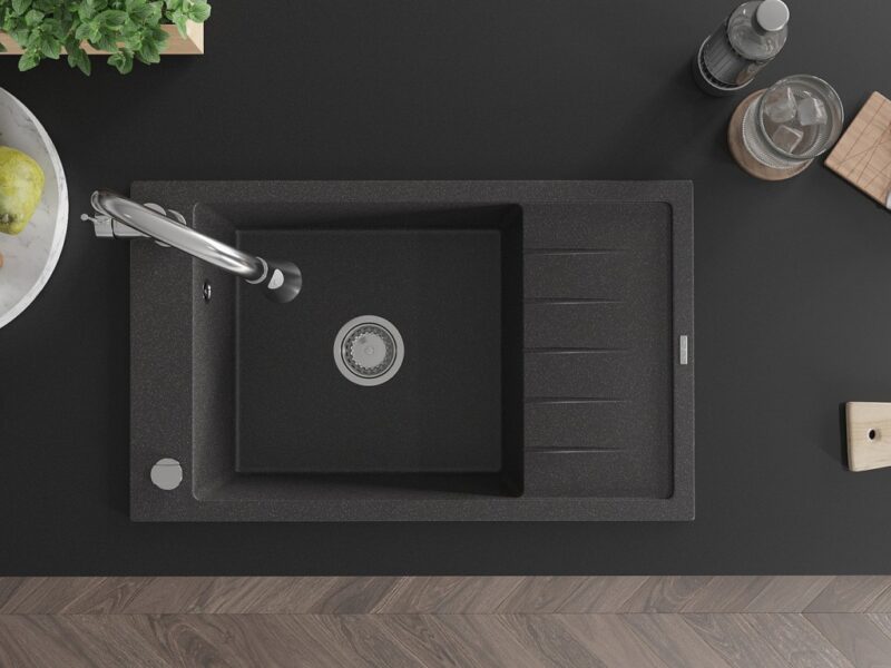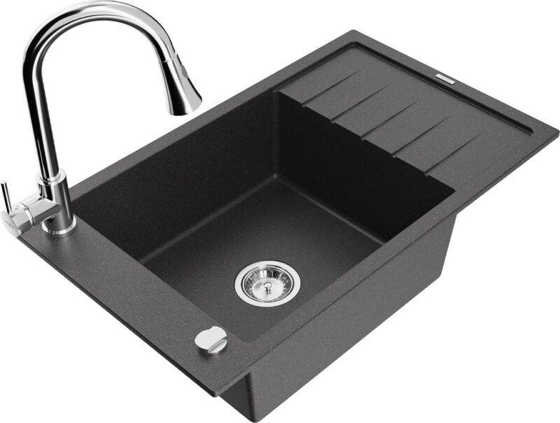 Technické dáta: drez: Rozmer: 795 x 480 x 200 mm Hĺbka komory: 190 mm Rozmery komory: 465×420 mm Priemer odtoku: ø90 mm Typ: 1-miska s krátkym odkvapkávačom Typ: Zapustené do pracovnej dosky Farba: Škvrnitá čierna Povrchová úprava sifónu: Chrome Materiál: žula (80% žulové kamenivo, 20% živice) Prepadový otvor: Áno Otvory: (batérie, automatické) 2 Inštalácia: Univerzálna, je možné inštalovať s odkvapkávačom na ľavú alebo pravú stranu Vysoká odolnosť proti poškriabaniu a zmene farby Odolnosť proti tepelným šokom Ľahko čistiteľný povrch Jeden dodatočný vyfrézovaný otvor na samodierovanie ø35 kuchynská batéria: Materiál: mosadz Farba: Chrome Hlava: Keramická Prevzdušňovač: Áno Typ: Jedna páka Výška batérie: 380 mm Rozsah výtoku: 252 mm Typ výtoku: Výsuvný(GT) Ean: 5905315029911