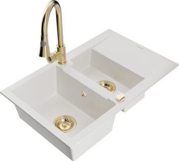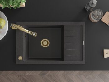 Technické dáta: drez: Rozmer: 795 x 480 x 200 mm Hĺbka komory: 190 mm Rozmery komory: 465×420 mm Priemer odtoku: ø90 mm Typ: 1-miska s krátkym odkvapkávačom Typ: Zapustené do pracovnej dosky Farba: Škvrnitá čierna Povrchová úprava sifónu: zlatá Materiál: žula (80% žulové kamenivo, 20% živice) Prepadový otvor: Áno Otvory: (batérie, automatické) 2 Inštalácia: Univerzálna, je možné inštalovať s odkvapkávačom na ľavú alebo pravú stranu Vysoká odolnosť proti poškriabaniu a zmene farby Odolnosť proti tepelným šokom Ľahko čistiteľný povrch Jeden dodatočný vyfrézovaný otvor na samodierovanie ø35 kuchynská batéria: Materiál: mosadz Farba: Zlatá Hlava: Keramická Prevzdušňovač: Áno Typ: Jedna páka Výška batérie: 380 mm Rozsah výtoku: 252 mm Typ výtoku: Výsuvný(GT) Ean: 5905315029928
