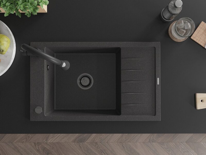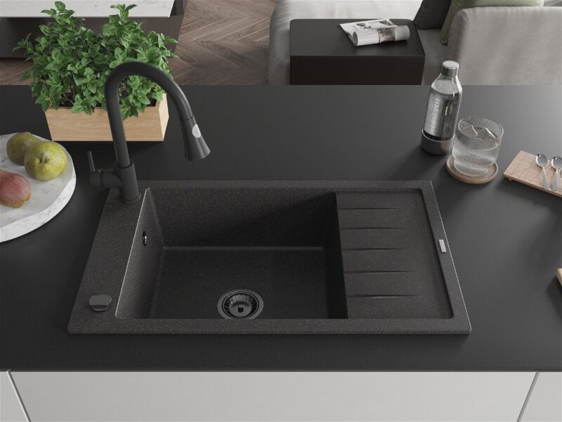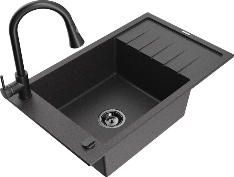 Technické dáta: drez: Rozmer: 795 x 480 x 200 mm Hĺbka komory: 190 mm Rozmery komory: 465×420 mm Priemer odtoku: ø90 mm Typ: 1-miska s krátkym odkvapkávačom Typ: Zapustené do pracovnej dosky Farba: Škvrnitá čierna Povrchová úprava sifónu: čierna Materiál: žula (80% žulové kamenivo, 20% živice) Prepadový otvor: Áno Otvory: (batérie, automatické) 2 Inštalácia: Univerzálna, je možné inštalovať s odkvapkávačom na ľavú alebo pravú stranu Vysoká odolnosť proti poškriabaniu a zmene farby Odolnosť proti tepelným šokom Ľahko čistiteľný povrch Jeden dodatočný vyfrézovaný otvor na samodierovanie ø35 kuchynská batéria: Materiál: mosadz Čierna farba Hlava: Keramická Prevzdušňovač: Áno Typ: Jedna páka Výška batérie: 380 mm Rozsah výtoku: 252 mm Typ výtoku: Výsuvný(GT) Ean: 5905315029942