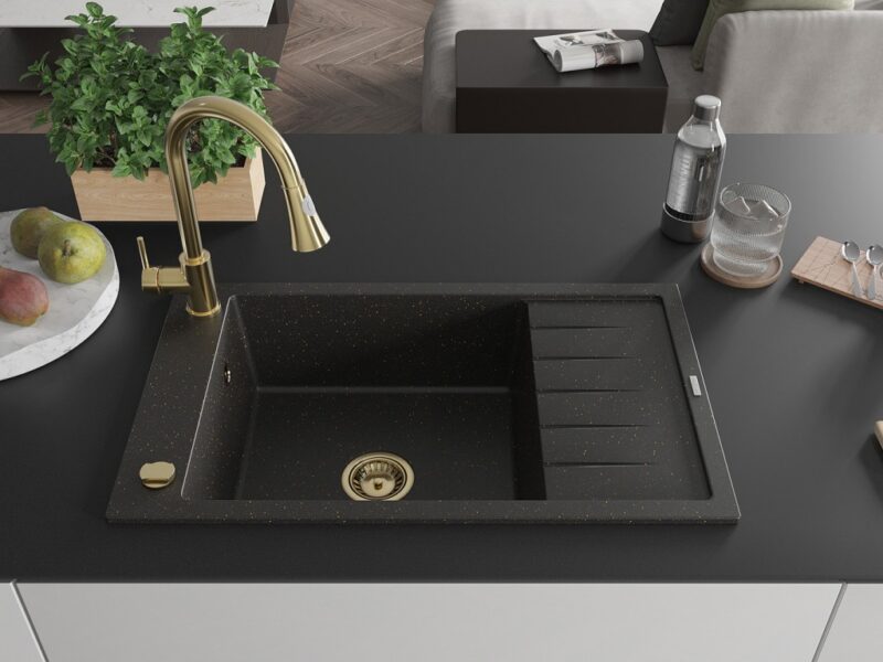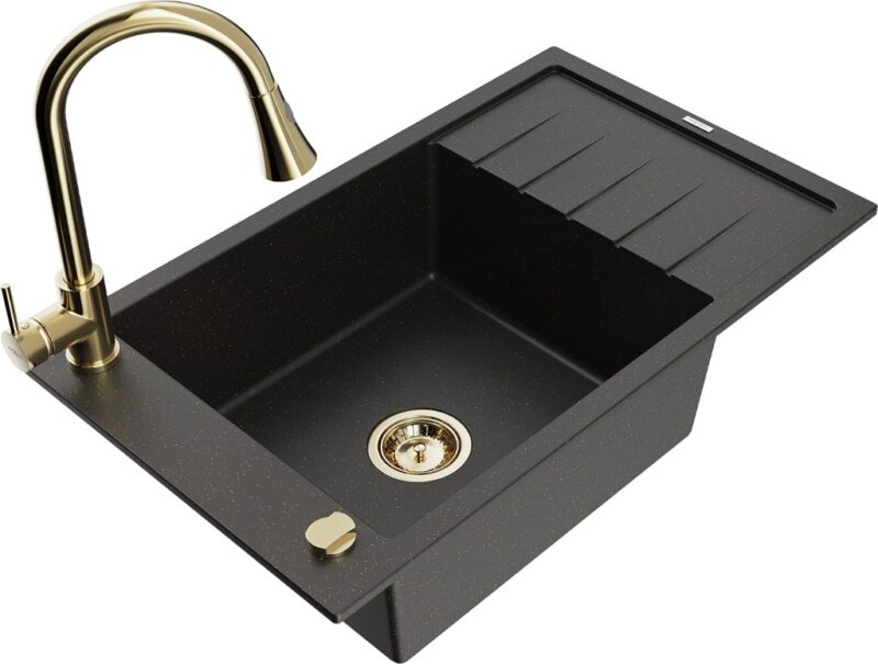 Technické dáta: drez: Rozmer: 795 x 480 x 200 mm Hĺbka komory: 190 mm Rozmery komory: 465×420 mm Priemer odtoku: ø90 mm Typ: 1-miska s krátkym odkvapkávačom Typ: Zapustené do pracovnej dosky Farba: čierna / zlatá metalíza Povrchová úprava sifónu: zlatá Materiál: žula (80% žulové kamenivo, 20% živice) Prepadový otvor: Áno Otvory: (batérie, automatické) 2 Inštalácia: Univerzálna, je možné inštalovať s odkvapkávačom na ľavú alebo pravú stranu Vysoká odolnosť proti poškriabaniu a zmene farby Odolnosť proti tepelným šokom Ľahko čistiteľný povrch Jeden dodatočný vyfrézovaný otvor na samodierovanie ø35 kuchynská batéria: Materiál: mosadz Farba: Zlatá Hlava: Keramická Prevzdušňovač: Áno Typ: Jedna páka Výška batérie: 380 mm Rozsah výtoku: 252 mm Typ výtoku: Výsuvný(GT) Ean: 5905315029874