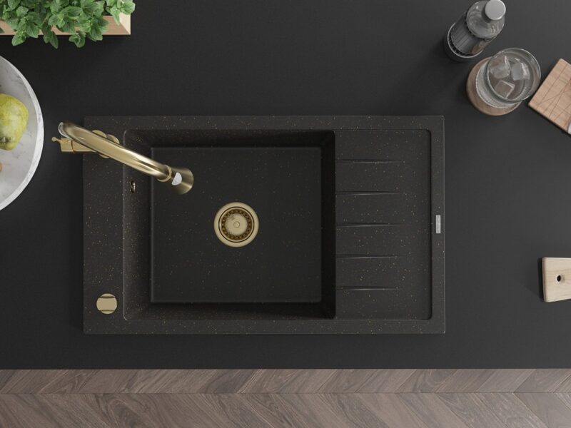 MEXEN/S MEXEN/S – Elias granitový drez 1 s odkvapkávačom vrátane batérie Elia, čierna/zlatá metalik 6511-75-670101-50