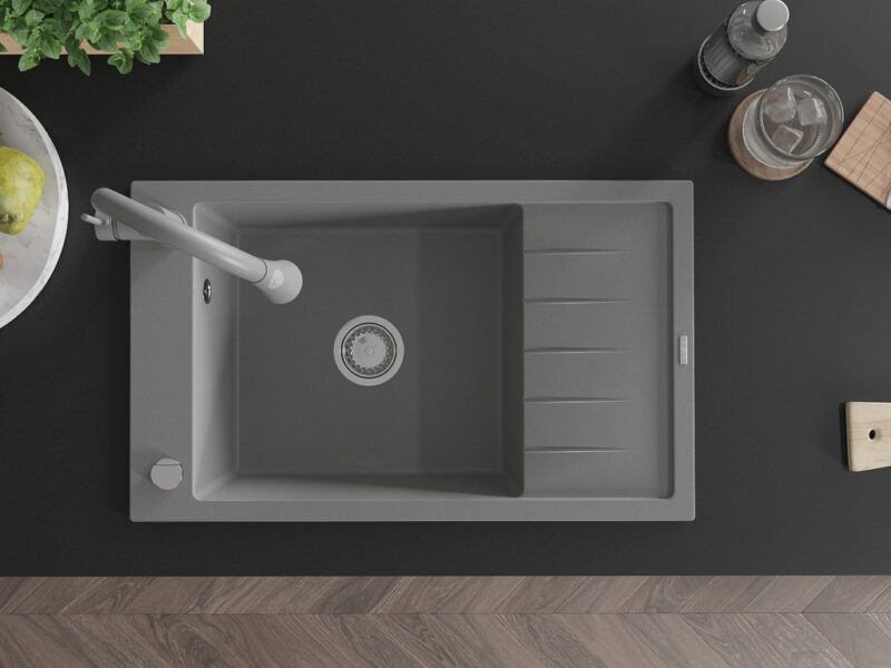 Technické dáta: drez: Rozmer: 795 x 480 x 200 mm Hĺbka komory: 190 mm Rozmery komory: 465×420 mm Priemer odtoku: ø90 mm Typ: 1-miska s krátkym odkvapkávačom Typ: Zapustené do pracovnej dosky Šedá farba Povrchová úprava sifónu: Chrome Materiál: žula (80% žulové kamenivo, 20% živice) Prepadový otvor: Áno Otvory: (batérie, automatické) 2 Inštalácia: Univerzálna, je možné inštalovať s odkvapkávačom na ľavú alebo pravú stranu Vysoká odolnosť proti poškriabaniu a zmene farby Odolnosť proti tepelným šokom Ľahko čistiteľný povrch Jeden dodatočný vyfrézovaný otvor na samodierovanie ø35 kuchynská batéria: Materiál: mosadz Šedá farba Hlava: Keramická Prevzdušňovač: Áno Typ: Jedna páka Výška batérie: 380 mm Rozsah výtoku: 252 mm Typ výtoku: Výsuvný(GT) Ean: 5905315029812