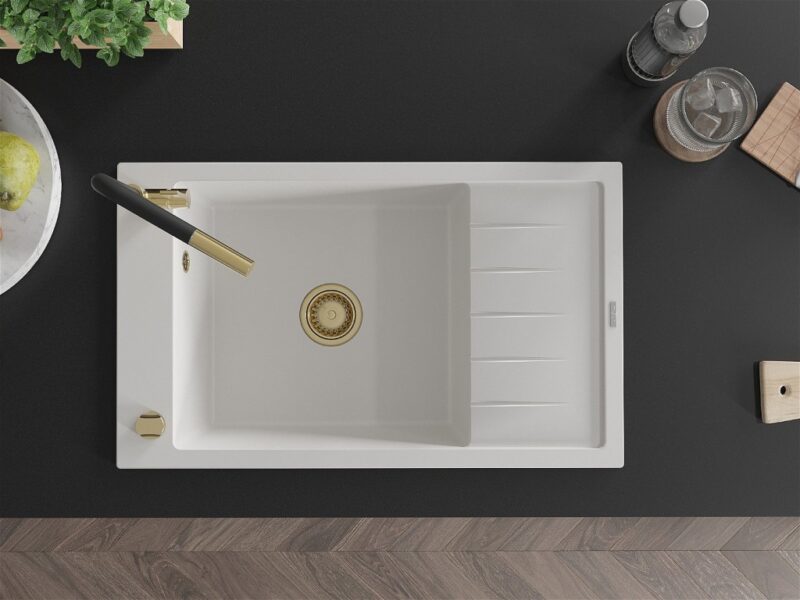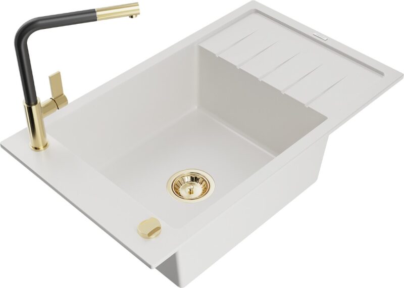 Technické dáta: drez: Rozmer: 795 x 480 x 200 mm Hĺbka komory: 190 mm Rozmery komory: 465×420 mm Priemer odtoku: ø90 mm Typ: 1-miska s krátkym odkvapkávačom Typ: Zapustené do pracovnej dosky biela farba Povrchová úprava sifónu: zlatá Materiál: žula (80% žulové kamenivo, 20% živice) Prepadový otvor: Áno Otvory: (batérie, automatické) 2 Inštalácia: Univerzálna, je možné inštalovať s odkvapkávačom na ľavú alebo pravú stranu Vysoká odolnosť proti poškriabaniu a zmene farby Odolnosť proti tepelným šokom Ľahko čistiteľný povrch Jeden dodatočný vyfrézovaný otvor na samodierovanie ø35 kuchynská batéria: Materiál: mosadz Farba: Zlatá/Čierna Hlava: Keramická Prevzdušňovač: Áno Typ: Jedna páka Rozsah výtoku: 245 mm Výška batérie: 307 mm(GT) Ean: 5905315060006