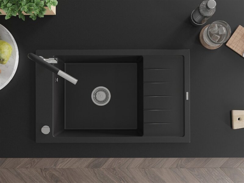 MEXEN/S MEXEN/S – Elias granitový drez 1 s odkvapkávačom vrátane batérie Flora, čierna 6511-77-670401-07
