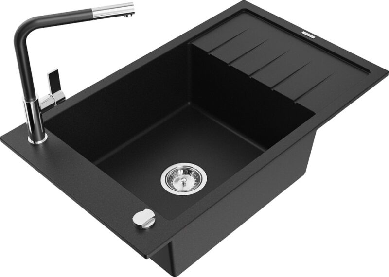 Technické dáta: drez: Rozmer: 795 x 480 x 200 mm Hĺbka komory: 190 mm Rozmery komory: 465×420 mm Priemer odtoku: ø90 mm Typ: 1-miska s krátkym odkvapkávačom Typ: Zapustené do pracovnej dosky Čierna farba Povrchová úprava sifónu: Chrome Materiál: žula (80% žulové kamenivo, 20% živice) Prepadový otvor: Áno Otvory: (batérie, automatické) 2 Inštalácia: Univerzálna, je možné inštalovať s odkvapkávačom na ľavú alebo pravú stranu Vysoká odolnosť proti poškriabaniu a zmene farby Odolnosť proti tepelným šokom Ľahko čistiteľný povrch Jeden dodatočný vyfrézovaný otvor na samodierovanie ø35 kuchynská batéria: Materiál: mosadz Farba: chróm/čierna Hlava: Keramická Prevzdušňovač: Áno Typ: Jedna páka Rozsah výtoku: 245 mm Výška batérie: 307 mm(GT) Ean: 5905315060402