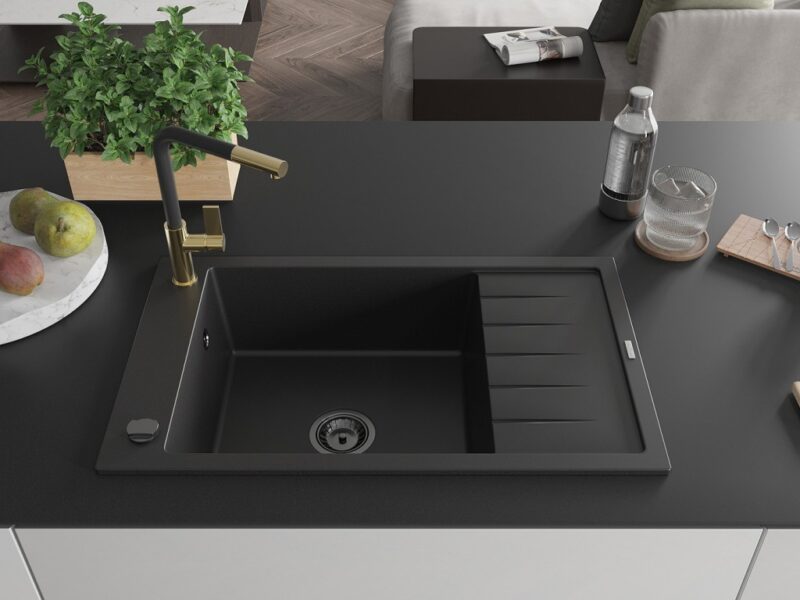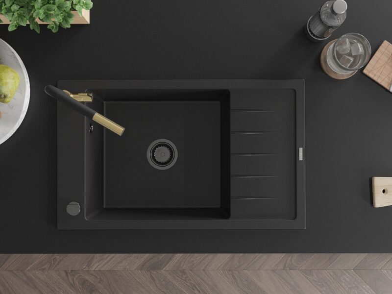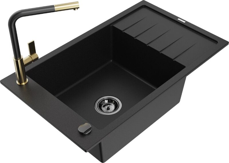 Technické dáta: drez: Rozmer: 795 x 480 x 200 mm Hĺbka komory: 190 mm Rozmery komory: 465×420 mm Priemer odtoku: ø90 mm Typ: 1-miska s krátkym odkvapkávačom Typ: Zapustené do pracovnej dosky Čierna farba Povrchová úprava sifónu: čierna Materiál: žula (80% žulové kamenivo, 20% živice) Prepadový otvor: Áno Otvory: (batérie, automatické) 2 Inštalácia: Univerzálna, je možné inštalovať s odkvapkávačom na ľavú alebo pravú stranu Vysoká odolnosť proti poškriabaniu a zmene farby Odolnosť proti tepelným šokom Ľahko čistiteľný povrch Jeden dodatočný vyfrézovaný otvor na samodierovanie ø35 kuchynská batéria: Materiál: mosadz Farba: Zlatá/Čierna Hlava: Keramická Prevzdušňovač: Áno Typ: Jedna páka Rozsah výtoku: 245 mm Výška batérie: 307 mm(GT) Ean: 5905315060433