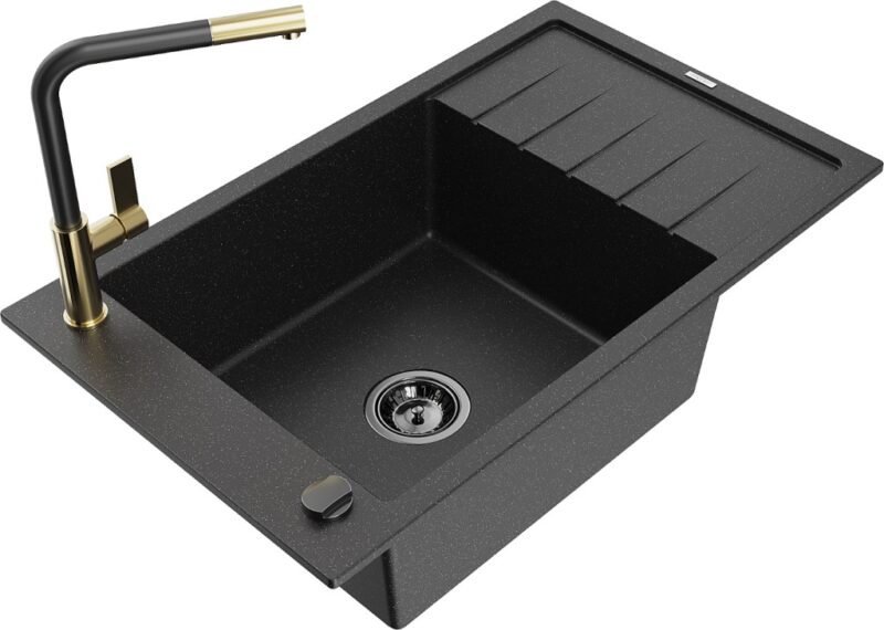 Technické dáta: drez: Rozmer: 795 x 480 x 200 mm Hĺbka komory: 190 mm Rozmery komory: 465×420 mm Priemer odtoku: ø90 mm Typ: 1-miska s krátkym odkvapkávačom Typ: Zapustené do pracovnej dosky Farba: čierna/strieborná metalíza Povrchová úprava sifónu: čierna Materiál: žula (80% žulové kamenivo, 20% živice) Prepadový otvor: Áno Otvory: (batérie, automatické) 2 Inštalácia: Univerzálna, je možné inštalovať s odkvapkávačom na ľavú alebo pravú stranu Vysoká odolnosť proti poškriabaniu a zmene farby Odolnosť proti tepelným šokom Ľahko čistiteľný povrch Jeden dodatočný vyfrézovaný otvor na samodierovanie ø35 kuchynská batéria: Materiál: mosadz Farba: Zlatá/Čierna Hlava: Keramická Prevzdušňovač: Áno Typ: Jedna páka Rozsah výtoku: 245 mm Výška batérie: 307 mm(GT) Ean: 5905315060211