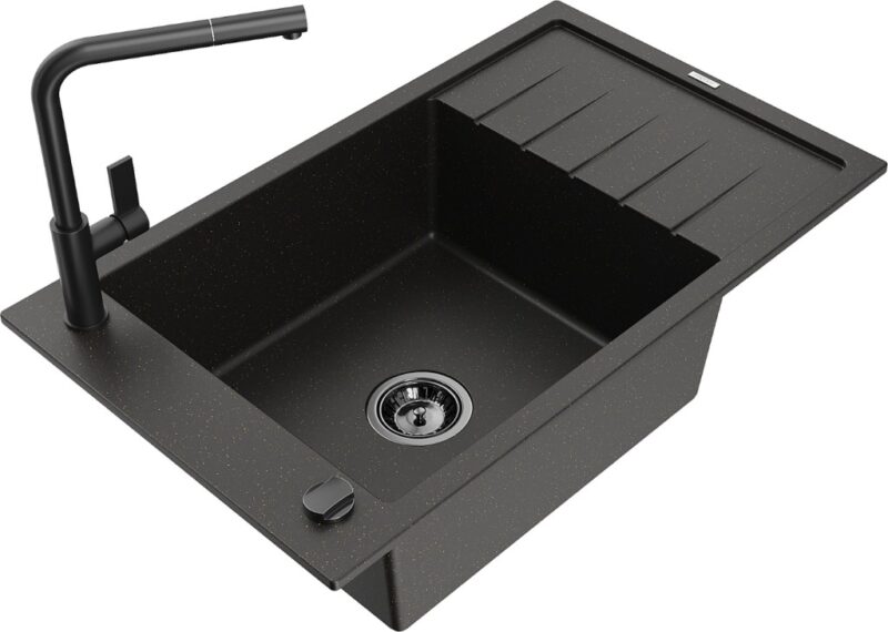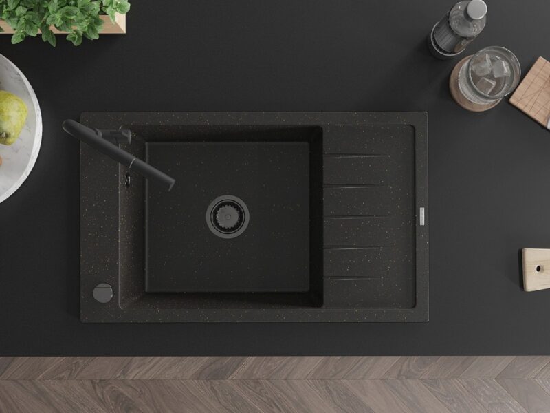 Technické dáta: drez: Rozmer: 795 x 480 x 200 mm Hĺbka komory: 190 mm Rozmery komory: 465×420 mm Priemer odtoku: ø90 mm Typ: 1-miska s krátkym odkvapkávačom Typ: Zapustené do pracovnej dosky Farba: čierna / zlatá metalíza Povrchová úprava sifónu: čierna Materiál: žula (80% žulové kamenivo, 20% živice) Prepadový otvor: Áno Otvory: (batérie, automatické) 2 Inštalácia: Univerzálna, je možné inštalovať s odkvapkávačom na ľavú alebo pravú stranu Vysoká odolnosť proti poškriabaniu a zmene farby Odolnosť proti tepelným šokom Ľahko čistiteľný povrch Jeden dodatočný vyfrézovaný otvor na samodierovanie ø35 kuchynská batéria: Materiál: mosadz Čierna farba Hlava: Keramická Prevzdušňovač: Áno Typ: Jedna páka Rozsah výtoku: 245 mm Výška batérie: 307 mm(GT) Ean: 5905315060280