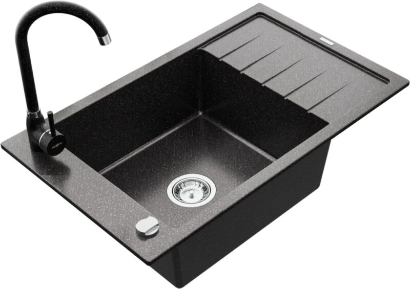 Technické dáta: drez: Rozmer: 795 x 480 x 200 mm Hĺbka komory: 190 mm Rozmery komory: 465×420 mm Priemer odtoku: ø90 mm Typ: 1-miska s krátkym odkvapkávačom Typ: Zapustené do pracovnej dosky Farba: Škvrnitá čierna Povrchová úprava sifónu: Chrome Materiál: žula (80% žulové kamenivo, 20% živice) Prepadový otvor: Áno Otvory: (batérie, automatické) 2 Inštalácia: Univerzálna, je možné inštalovať s odkvapkávačom na ľavú alebo pravú stranu Vysoká odolnosť proti poškriabaniu a zmene farby Odolnosť proti tepelným šokom Ľahko čistiteľný povrch Jeden dodatočný vyfrézovaný otvor na samodierovanie ø35 kuchynská batéria: Materiál: mosadz Farba: Škvrnitá čierna Hlava: Keramická Prevzdušňovač: Áno Výška batérie: 335 mm Rozsah výtoku: 180 mm(GT) Ean: 5907709160422