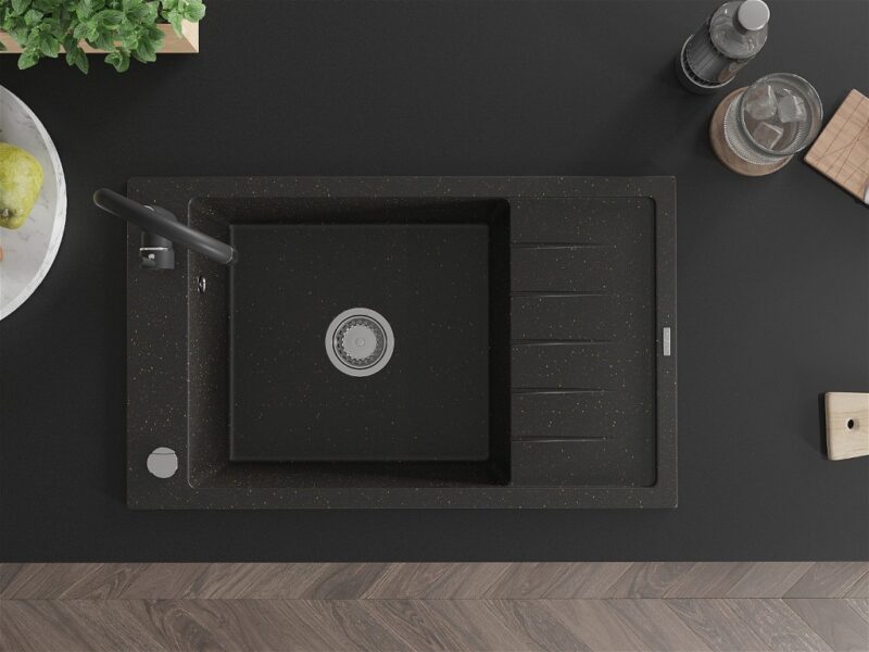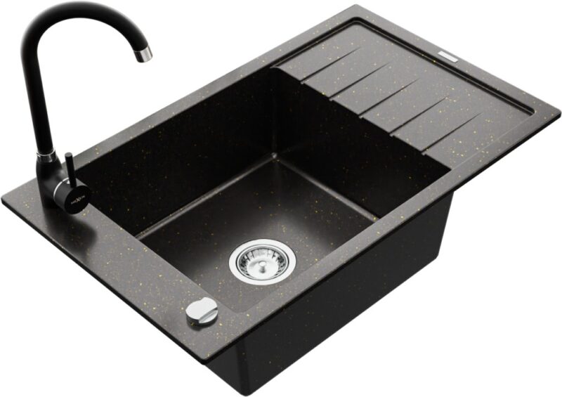 Technické dáta: drez: Rozmer: 795 x 480 x 200 mm Hĺbka komory: 190 mm Rozmery komory: 465×420 mm Priemer odtoku: ø90 mm Typ: 1-miska s krátkym odkvapkávačom Typ: Zapustené do pracovnej dosky Farba: čierna / zlatá metalíza Povrchová úprava sifónu: Chrome Materiál: žula (80% žulové kamenivo, 20% živice) Prepadový otvor: Áno Otvory: (batérie, automatické) 2 Inštalácia: Univerzálna, je možné inštalovať s odkvapkávačom na ľavú alebo pravú stranu Vysoká odolnosť proti poškriabaniu a zmene farby Odolnosť proti tepelným šokom Ľahko čistiteľný povrch Jeden dodatočný vyfrézovaný otvor na samodierovanie ø35 kuchynská batéria: Materiál: mosadz Čierna farba Hlava: Keramická Prevzdušňovač: Áno Výška batérie: 335 mm Rozsah výtoku: 180 mm(GT) Ean: 5907709160392
