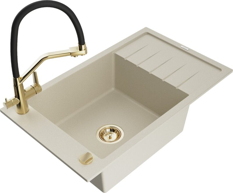 Technické dáta: Drez: Rozmer: 795x480x200 mm Hĺbka komory: 190 mm Rozmery komory: 465×420 mm Priemer odtoku: ø90 mm Typ: 1-miska s krátkym odkvapkávačom Typ: Zapustené do pracovnej dosky Farba béžová Povrchová úprava sifónu: zlatá Materiál: žula (80% žulové kamenivo 20% živice) Prepadový otvor: Áno Otvory: (batérie, automat) 2 Inštalácia: Univerzálna, je možné inštalovať s odkvapkávačom na ľavú alebo pravú stranu Vysoká odolnosť proti poškriabaniu a zmene farby Odolnosť proti tepelným šokom Povrch pre ľahké čistenie Jeden dodatočný vyfrézovaný otvor na samodierovanie ø35 Kuchynská batéria: Materiál: mosadz Farba: Zlatá/Čierna Hlavy: Keramické Perlátor: Áno Typ výtoku: Flexibilný s mosadznou podperou Rozsah výtoku: 260 mm Výška: 405 mm Typ: Dve rukoväte Dvojhlavá batéria s prídavným filtrom na pitnú vodu(GT) Ean: 5905315101242