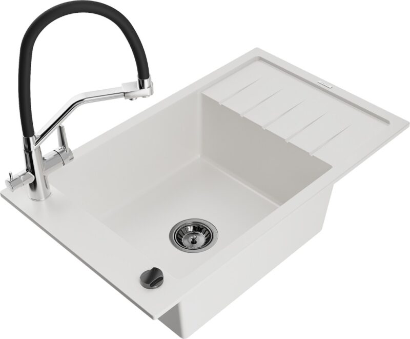 Technické dáta: drez: Rozmer: 795 x 480 x 200 mm Hĺbka komory: 190 mm Rozmery komory: 465×420 mm Priemer odtoku: ø90 mm Typ: 1-miska s krátkym odkvapkávačom Typ: Zapustené do pracovnej dosky biela farba Povrchová úprava sifónu: čierna Materiál: žula (80% žulové kamenivo, 20% živice) Prepadový otvor: Áno Otvory: (batérie, automatické) 2 Inštalácia: Univerzálna, je možné inštalovať s odkvapkávačom na ľavú alebo pravú stranu Vysoká odolnosť proti poškriabaniu a zmene farby Odolnosť proti tepelným šokom Ľahko čistiteľný povrch Jeden dodatočný vyfrézovaný otvor na samodierovanie ø35 kuchynská batéria: Materiál: mosadz Farba: chróm/čierna Hlavy: Keramické Prevzdušňovač: Áno Typ hubica: Flexibilný s mosadzným držiakom Rozsah výtoku: 260 mm Výška: 405 mm Typ: Dve rukoväte Dvojhlavá batéria s prídavným filtrom na pitnú vodu(GT) Ean: 5905315101181