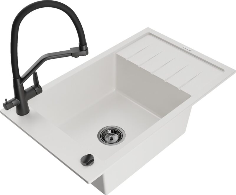 MEXEN/S MEXEN/S – Elias granitový drez s odkvapkávačom vrátane batérie Duo, biela 6511-20-671701-70-B