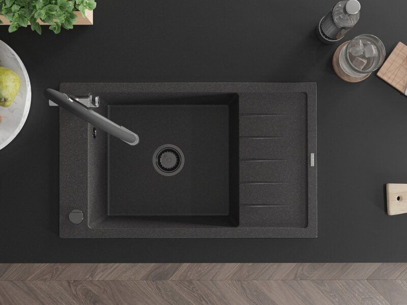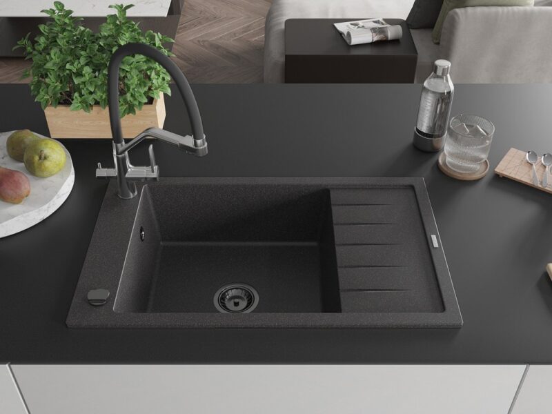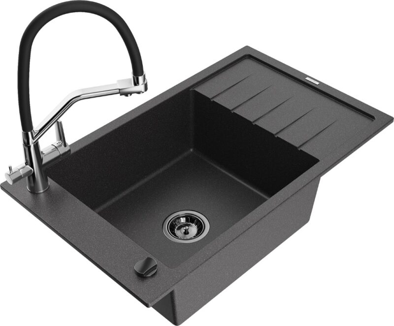 Technické dáta: drez: Rozmer: 795 x 480 x 200 mm Hĺbka komory: 190 mm Rozmery komory: 465×420 mm Priemer odtoku: ø90 mm Typ: 1-miska s krátkym odkvapkávačom Typ: Zapustené do pracovnej dosky Farba: Škvrnitá čierna Povrchová úprava sifónu: čierna Materiál: žula (80% žulové kamenivo, 20% živice) Prepadový otvor: Áno Otvory: (batérie, automatické) 2 Inštalácia: Univerzálna, je možné inštalovať s odkvapkávačom na ľavú alebo pravú stranu Vysoká odolnosť proti poškriabaniu a zmene farby Odolnosť proti tepelným šokom Ľahko čistiteľný povrch Jeden dodatočný vyfrézovaný otvor na samodierovanie ø35 kuchynská batéria: Materiál: mosadz Farba: chróm/čierna Hlavy: Keramické Prevzdušňovač: Áno Typ hubica: Flexibilný s mosadzným držiakom Rozsah výtoku: 260 mm Výška: 405 mm Typ: Dve rukoväte Dvojhlavá batéria s prídavným filtrom na pitnú vodu(GT) Ean: 5905315101433