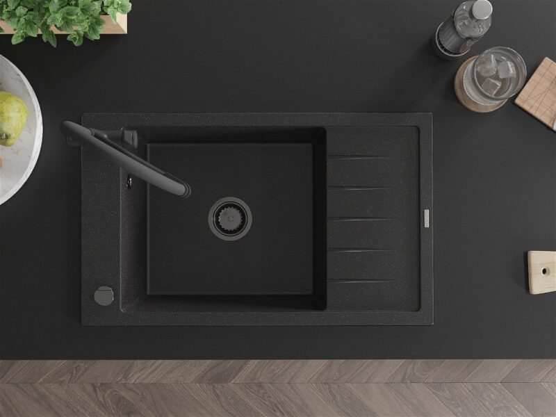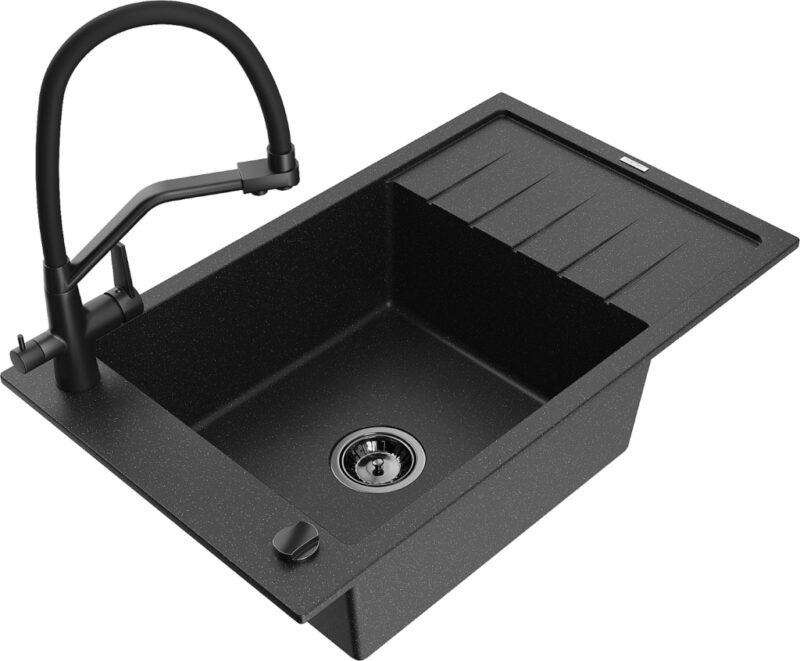 Technické dáta: drez: Rozmer: 795 x 480 x 200 mm Hĺbka komory: 190 mm Rozmery komory: 465×420 mm Priemer odtoku: ø90 mm Typ: 1-miska s krátkym odkvapkávačom Typ: Zapustené do pracovnej dosky Farba: čierna/strieborná metalíza Povrchová úprava sifónu: čierna Materiál: žula (80% žulové kamenivo, 20% živice) Prepadový otvor: Áno Otvory: (batérie, automatické) 2 Inštalácia: Univerzálna, je možné inštalovať s odkvapkávačom na ľavú alebo pravú stranu Vysoká odolnosť proti poškriabaniu a zmene farby Odolnosť proti tepelným šokom Ľahko čistiteľný povrch Jeden dodatočný vyfrézovaný otvor na samodierovanie ø35 kuchynská batéria: Materiál: mosadz Čierna farba Hlavy: Keramické Prevzdušňovač: Áno Typ hubica: Flexibilný s mosadzným držiakom Rozsah výtoku: 260 mm Výška: 405 mm Typ: Dve rukoväte Dvojhlavá batéria s prídavným filtrom na pitnú vodu(GT) Ean: 5905315101365