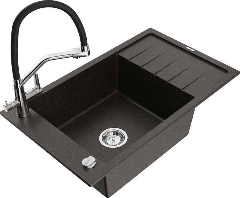 Technické dáta: drez: Rozmer: 795 x 480 x 200 mm Hĺbka komory: 190 mm Rozmery komory: 465×420 mm Priemer odtoku: ø90 mm Typ: 1-miska s krátkym odkvapkávačom Typ: Zapustené do pracovnej dosky Farba: čierna / zlatá metalíza Povrchová úprava sifónu: Chrome Materiál: žula (80% žulové kamenivo, 20% živice) Prepadový otvor: Áno Otvory: (batérie, automatické) 2 Inštalácia: Univerzálna, je možné inštalovať s odkvapkávačom na ľavú alebo pravú stranu Vysoká odolnosť proti poškriabaniu a zmene farby Odolnosť proti tepelným šokom Ľahko čistiteľný povrch Jeden dodatočný vyfrézovaný otvor na samodierovanie ø35 kuchynská batéria: Materiál: mosadz Farba: chróm/čierna Hlavy: Keramické Prevzdušňovač: Áno Typ hubica: Flexibilný s mosadzným držiakom Rozsah výtoku: 260 mm Výška: 405 mm Typ: Dve rukoväte Dvojhlavá batéria s prídavným filtrom na pitnú vodu(GT) Ean: 5905315101372