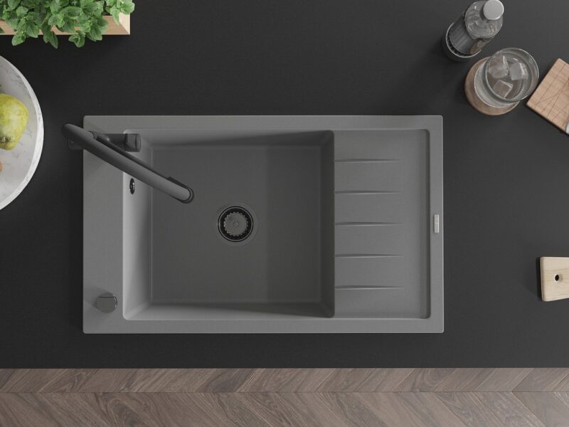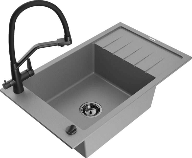 Technické dáta: drez: Rozmer: 795 x 480 x 200 mm Hĺbka komory: 190 mm Rozmery komory: 465×420 mm Priemer odtoku: ø90 mm Typ: 1-miska s krátkym odkvapkávačom Typ: Zapustené do pracovnej dosky Šedá farba Povrchová úprava sifónu: čierna Materiál: žula (80% žulové kamenivo, 20% živice) Prepadový otvor: Áno Otvory: (batérie, automatické) 2 Inštalácia: Univerzálna, je možné inštalovať s odkvapkávačom na ľavú alebo pravú stranu Vysoká odolnosť proti poškriabaniu a zmene farby Odolnosť proti tepelným šokom Ľahko čistiteľný povrch Jeden dodatočný vyfrézovaný otvor na samodierovanie ø35 kuchynská batéria: Materiál: mosadz Čierna farba Hlavy: Keramické Prevzdušňovač: Áno Typ hubica: Flexibilný s mosadzným držiakom Rozsah výtoku: 260 mm Výška: 405 mm Typ: Dve rukoväte Dvojhlavá batéria s prídavným filtrom na pitnú vodu(GT) Ean: 5905315101310