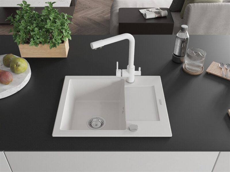Technické dáta: drez: Rozmer: 576x465x174mm Hĺbka komory: 164 mm Rozmery komory: 395×320 mm Priemer odtoku: ø90 mm Typ: 1-miska s krátkym odkvapkávačom Typ: Zapustené do pracovnej dosky biela farba Povrchová úprava sifónu: Chrome Materiál: žula (80% žulové kamenivo, 20% živice) Prepadový otvor: Áno Otvory: (batérie, automatické) 2 Inštalácia: Univerzálna, je možné inštalovať s odkvapkávačom na ľavú alebo pravú stranu Vysoká odolnosť proti poškriabaniu a zmene farby Odolnosť proti tepelným šokom Ľahko čistiteľný povrch Dva dodatočné vyfrézované otvory na samodierovanie ø35 kuchynská batéria: Materiál: mosadz biela farba Hlava: Keramická Prevzdušňovač: Áno Typ: Dve rukoväte Rozsah výtoku: 235 mm Výška batérie: 315 mm Dvojhlavá batéria s prídavným kanálom pre filtrovanú pitnú vodu(GT) Ean: 5905315023629