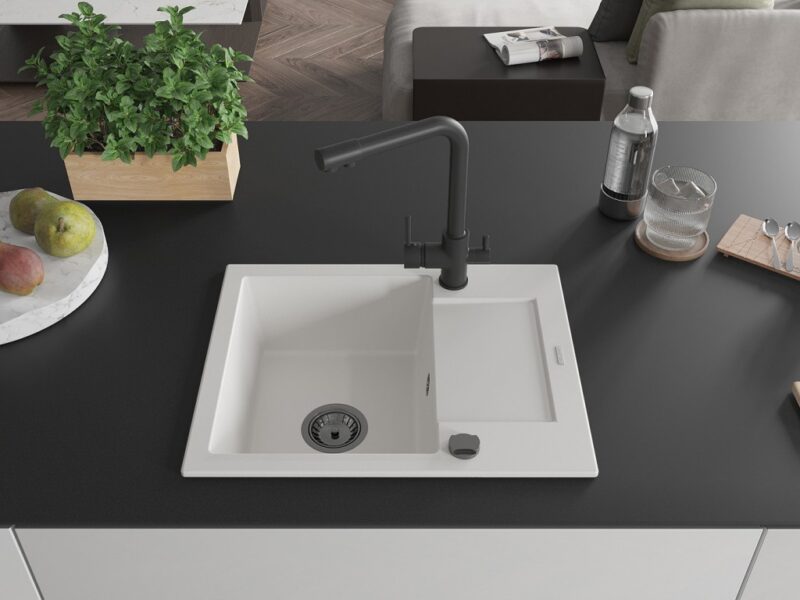 Technické dáta: drez: Rozmer: 576x465x174mm Hĺbka komory: 164 mm Rozmery komory: 395×320 mm Priemer odtoku: ø90 mm Typ: 1-miska s krátkym odkvapkávačom Typ: Zapustené do pracovnej dosky biela farba Povrchová úprava sifónu: čierna Materiál: žula (80% žulové kamenivo, 20% živice) Prepadový otvor: Áno Otvory: (batérie, automatické) 2 Inštalácia: Univerzálna, je možné inštalovať s odkvapkávačom na ľavú alebo pravú stranu Vysoká odolnosť proti poškriabaniu a zmene farby Odolnosť proti tepelným šokom Ľahko čistiteľný povrch Dva dodatočné vyfrézované otvory na samodierovanie ø35 kuchynská batéria: Materiál: mosadz Čierna farba Hlava: Keramická Prevzdušňovač: Áno Typ: Dve rukoväte Rozsah výtoku: 235 mm Výška batérie: 315 mm Dvojhlavá batéria s prídavným kanálom pre filtrovanú pitnú vodu(GT) Ean: 5905315023643