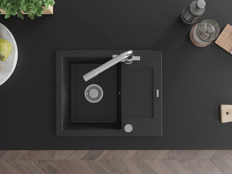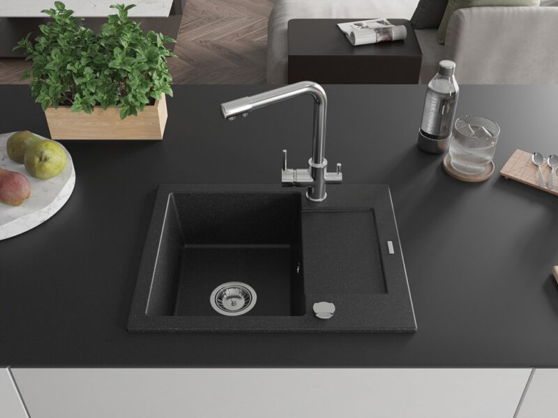 Technické dáta: drez: Rozmer: 576x465x174mm Hĺbka komory: 164 mm Rozmery komory: 395×320 mm Priemer odtoku: ø90 mm Typ: 1-miska s krátkym odkvapkávačom Typ: Zapustené do pracovnej dosky Farba: čierna/strieborná metalíza Povrchová úprava sifónu: Chrome Materiál: žula (80% žulové kamenivo, 20% živice) Prepadový otvor: Áno Otvory: (batérie, automatické) 2 Inštalácia: Univerzálna, je možné inštalovať s odkvapkávačom na ľavú alebo pravú stranu Vysoká odolnosť proti poškriabaniu a zmene farby Odolnosť proti tepelným šokom Ľahko čistiteľný povrch Dva dodatočné vyfrézované otvory na samodierovanie ø35 kuchynská batéria: Materiál: mosadz Farba: Chrome Hlava: Keramická Prevzdušňovač: Áno Typ: Dve rukoväte Rozsah výtoku: 235 mm Výška batérie: 315 mm Dvojhlavá batéria s prídavným kanálom pre filtrovanú pitnú vodu(GT) Ean: 5905315023742