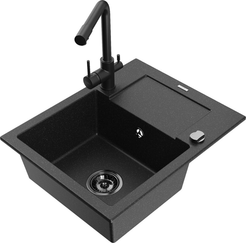 Technické dáta: drez: Rozmer: 576x465x174mm Hĺbka komory: 164 mm Rozmery komory: 395×320 mm Priemer odtoku: ø90 mm Typ: 1-miska s krátkym odkvapkávačom Typ: Zapustené do pracovnej dosky Farba: čierna/strieborná metalíza Povrchová úprava sifónu: čierna Materiál: žula (80% žulové kamenivo, 20% živice) Prepadový otvor: Áno Otvory: (batérie, automatické) 2 Inštalácia: Univerzálna, je možné inštalovať s odkvapkávačom na ľavú alebo pravú stranu Vysoká odolnosť proti poškriabaniu a zmene farby Odolnosť proti tepelným šokom Ľahko čistiteľný povrch Dva dodatočné vyfrézované otvory na samodierovanie ø35 kuchynská batéria: Materiál: mosadz Čierna farba Hlava: Keramická Prevzdušňovač: Áno Typ: Dve rukoväte Rozsah výtoku: 235 mm Výška batérie: 315 mm Dvojhlavá batéria s prídavným kanálom pre filtrovanú pitnú vodu(GT) Ean: 5905315023766