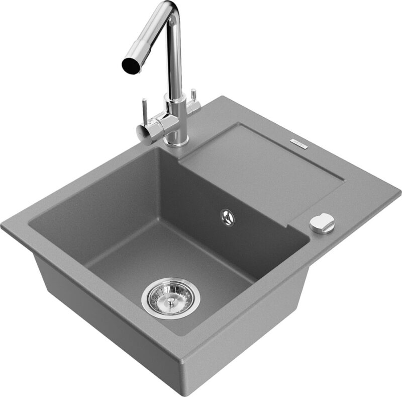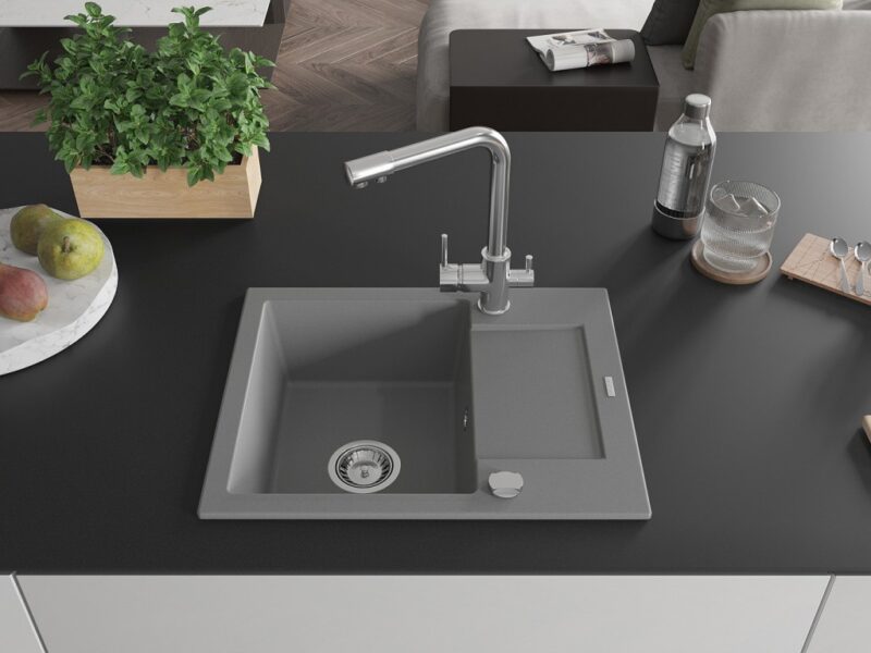 Technické dáta: drez: Rozmer: 576x465x174mm Hĺbka komory: 164 mm Rozmery komory: 395×320 mm Priemer odtoku: ø90 mm Typ: 1-miska s krátkym odkvapkávačom Typ: Zapustené do pracovnej dosky Šedá farba Povrchová úprava sifónu: Chrome Materiál: žula (80% žulové kamenivo, 20% živice) Prepadový otvor: Áno Otvory: (batérie, automatické) 2 Inštalácia: Univerzálna, je možné inštalovať s odkvapkávačom na ľavú alebo pravú stranu Vysoká odolnosť proti poškriabaniu a zmene farby Odolnosť proti tepelným šokom Ľahko čistiteľný povrch Dva dodatočné vyfrézované otvory na samodierovanie ø35 kuchynská batéria: Materiál: mosadz Farba: Chrome Hlava: Keramická Prevzdušňovač: Áno Typ: Dve rukoväte Rozsah výtoku: 235 mm Výška batérie: 315 mm Dvojhlavá batéria s prídavným kanálom pre filtrovanú pitnú vodu(GT) Ean: 5905315023698
