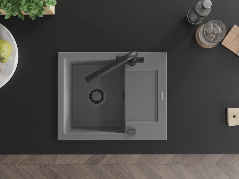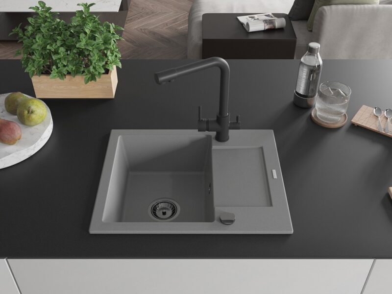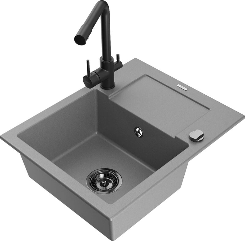 Technické dáta: drez: Rozmer: 576x465x174mm Hĺbka komory: 164 mm Rozmery komory: 395×320 mm Priemer odtoku: ø90 mm Typ: 1-miska s krátkym odkvapkávačom Typ: Zapustené do pracovnej dosky Šedá farba Povrchová úprava sifónu: čierna Materiál: žula (80% žulové kamenivo, 20% živice) Prepadový otvor: Áno Otvory: (batérie, automatické) 2 Inštalácia: Univerzálna, je možné inštalovať s odkvapkávačom na ľavú alebo pravú stranu Vysoká odolnosť proti poškriabaniu a zmene farby Odolnosť proti tepelným šokom Ľahko čistiteľný povrch Dva dodatočné vyfrézované otvory na samodierovanie ø35 kuchynská batéria: Materiál: mosadz Čierna farba Hlava: Keramická Prevzdušňovač: Áno Typ: Dve rukoväte Rozsah výtoku: 235 mm Výška batérie: 315 mm Dvojhlavá batéria s prídavným kanálom pre filtrovanú pitnú vodu(GT) Ean: 5905315023728