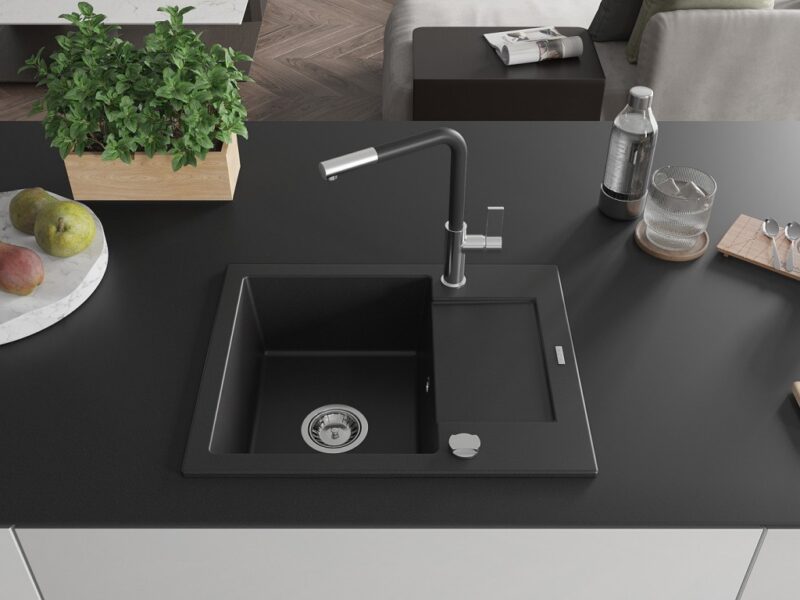 Technické dáta: drez: Rozmer: 576x465x174mm Hĺbka komory: 164 mm Rozmery komory: 395×320 mm Priemer odtoku: ø90 mm Typ: 1-miska s krátkym odkvapkávačom Typ: Zapustené do pracovnej dosky Čierna farba Povrchová úprava sifónu: Chrome Materiál: žula (80% žulové kamenivo, 20% živice) Prepadový otvor: Áno Otvory: (batérie, automatické) 2 Inštalácia: Univerzálna, je možné inštalovať s odkvapkávačom na ľavú alebo pravú stranu Vysoká odolnosť proti poškriabaniu a zmene farby Odolnosť proti tepelným šokom Ľahko čistiteľný povrch Dva dodatočné vyfrézované otvory na samodierovanie ø35 kuchynská batéria: Materiál: mosadz Farba: chróm/čierna Hlava: Keramická Prevzdušňovač: Áno Typ: Jedna páka Rozsah výtoku: 245 mm Výška batérie: 307 mm(GT) Ean: 5905315058904
