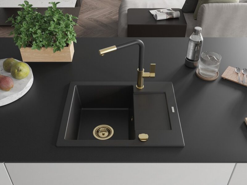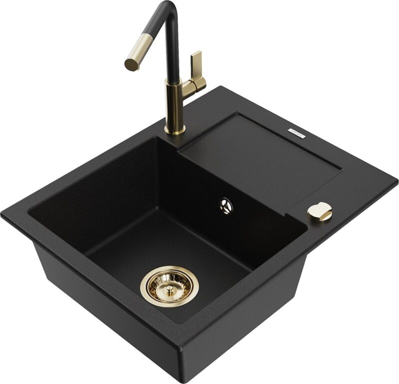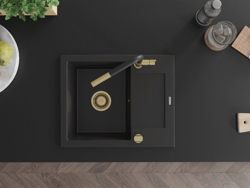 Technické dáta: drez: Rozmer: 576x465x174mm Hĺbka komory: 164 mm Rozmery komory: 395×320 mm Priemer odtoku: ø90 mm Typ: 1-miska s krátkym odkvapkávačom Typ: Zapustené do pracovnej dosky Čierna farba Povrchová úprava sifónu: zlatá Materiál: žula (80% žulové kamenivo, 20% živice) Prepadový otvor: Áno Otvory: (batérie, automatické) 2 Inštalácia: Univerzálna, je možné inštalovať s odkvapkávačom na ľavú alebo pravú stranu Vysoká odolnosť proti poškriabaniu a zmene farby Odolnosť proti tepelným šokom Ľahko čistiteľný povrch Dva dodatočné vyfrézované otvory na samodierovanie ø35 kuchynská batéria: Materiál: mosadz Farba: Zlatá/Čierna Hlava: Keramická Prevzdušňovač: Áno Typ: Jedna páka Rozsah výtoku: 245 mm Výška batérie: 307 mm(GT) Ean: 5905315058928