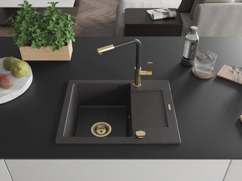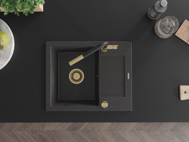 Technické dáta: drez: Rozmer: 576x465x174mm Hĺbka komory: 164 mm Rozmery komory: 395×320 mm Priemer odtoku: ø90 mm Typ: 1-miska s krátkym odkvapkávačom Typ: Zapustené do pracovnej dosky Farba: Škvrnitá čierna Povrchová úprava sifónu: zlatá Materiál: žula (80% žulové kamenivo, 20% živice) Prepadový otvor: Áno Otvory: (batérie, automatické) 2 Inštalácia: Univerzálna, je možné inštalovať s odkvapkávačom na ľavú alebo pravú stranu Vysoká odolnosť proti poškriabaniu a zmene farby Odolnosť proti tepelným šokom Ľahko čistiteľný povrch Dva dodatočné vyfrézované otvory na samodierovanie ø35 kuchynská batéria: Materiál: mosadz Farba: Zlatá/Čierna Hlava: Keramická Prevzdušňovač: Áno Typ: Jedna páka Rozsah výtoku: 245 mm Výška batérie: 307 mm(GT) Ean: 5905315058843