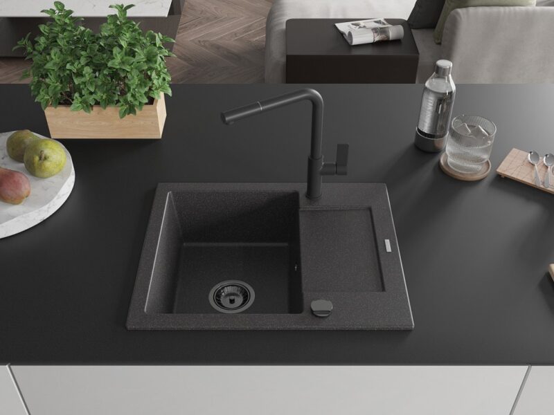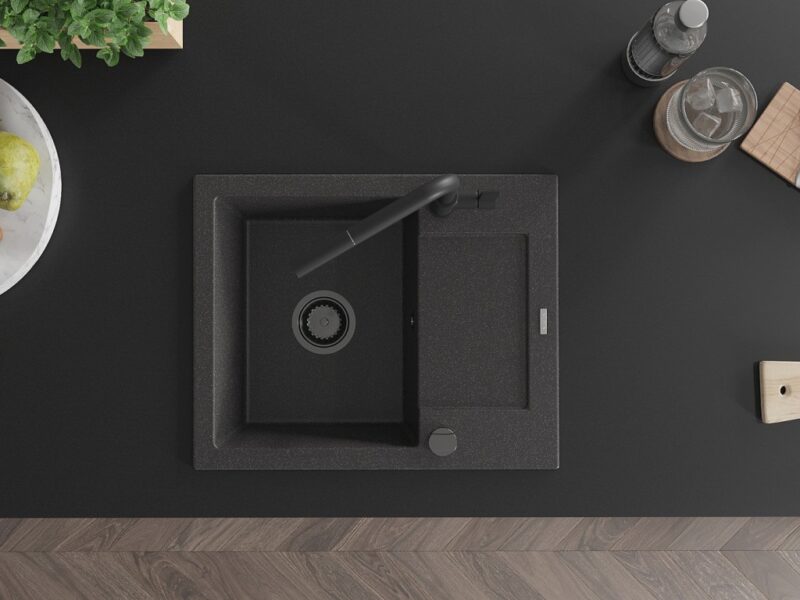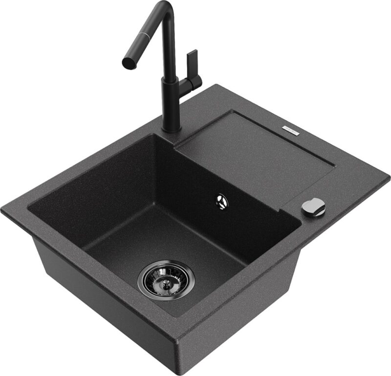 Technické dáta: drez: Rozmer: 576x465x174mm Hĺbka komory: 164 mm Rozmery komory: 395×320 mm Priemer odtoku: ø90 mm Typ: 1-miska s krátkym odkvapkávačom Typ: Zapustené do pracovnej dosky Farba: Škvrnitá čierna Povrchová úprava sifónu: čierna Materiál: žula (80% žulové kamenivo, 20% živice) Prepadový otvor: Áno Otvory: (batérie, automatické) 2 Inštalácia: Univerzálna, je možné inštalovať s odkvapkávačom na ľavú alebo pravú stranu Vysoká odolnosť proti poškriabaniu a zmene farby Odolnosť proti tepelným šokom Ľahko čistiteľný povrch Dva dodatočné vyfrézované otvory na samodierovanie ø35 kuchynská batéria: Materiál: mosadz Čierna farba Hlava: Keramická Prevzdušňovač: Áno Typ: Jedna páka Rozsah výtoku: 245 mm Výška batérie: 307 mm(GT) Ean: 5905315058867