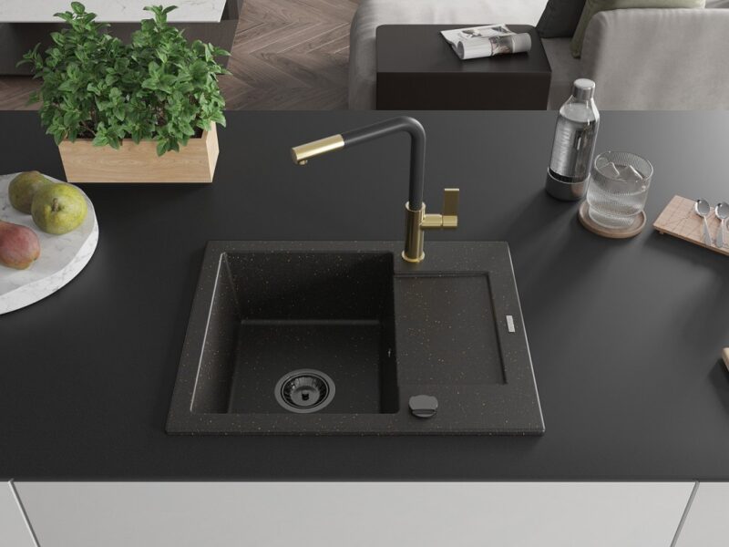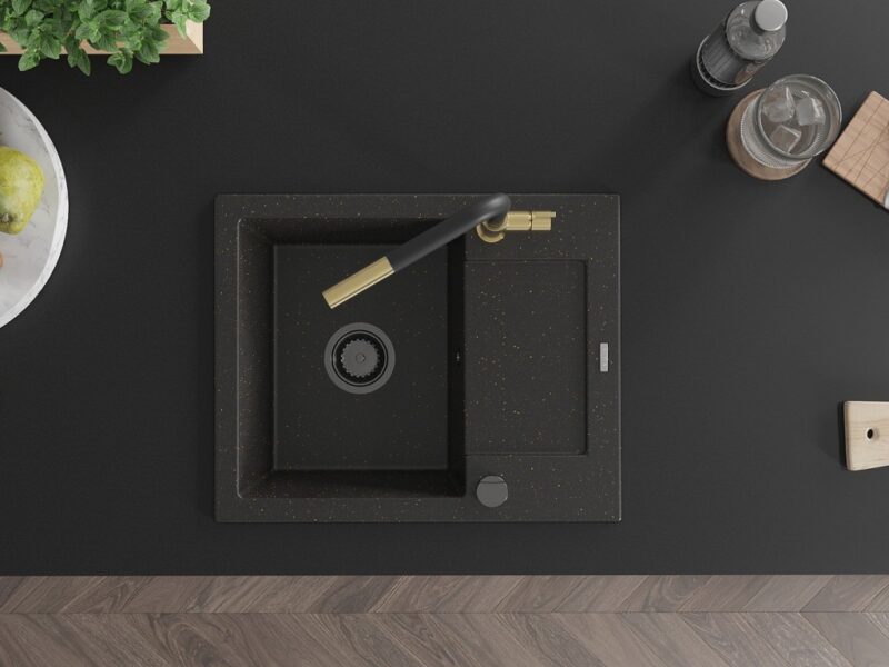 Technické dáta: drez: Rozmer: 576x465x174mm Hĺbka komory: 164 mm Rozmery komory: 395×320 mm Priemer odtoku: ø90 mm Typ: 1-miska s krátkym odkvapkávačom Typ: Zapustené do pracovnej dosky Farba: čierna / zlatá metalíza Povrchová úprava sifónu: čierna Materiál: žula (80% žulové kamenivo, 20% živice) Prepadový otvor: Áno Otvory: (batérie, automatické) 2 Inštalácia: Univerzálna, je možné inštalovať s odkvapkávačom na ľavú alebo pravú stranu Vysoká odolnosť proti poškriabaniu a zmene farby Odolnosť proti tepelným šokom Ľahko čistiteľný povrch Dva dodatočné vyfrézované otvory na samodierovanie ø35 kuchynská batéria: Materiál: mosadz Farba: Zlatá/Čierna Hlava: Keramická Prevzdušňovač: Áno Typ: Jedna páka Rozsah výtoku: 245 mm Výška batérie: 307 mm(GT) Ean: 5905315058775