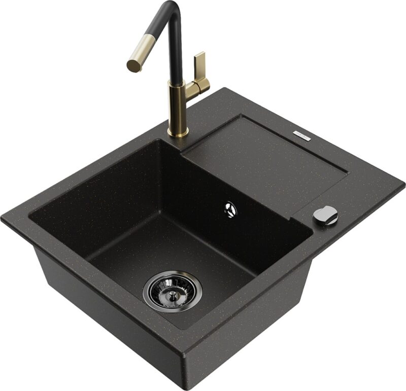 MEXEN/S MEXEN/S – Enzo granitový drez 1-miska s odkvapkávačom vrátane batérie Flora, čierna/zlatá metalik 6506-75-670401-57-B