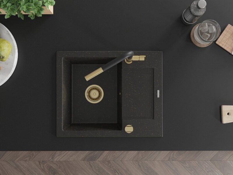 MEXEN/S MEXEN/S – Enzo granitový drez 1-miska s odkvapkávačom vrátane batérie Flora, čierna/zlatá metalik 6506-75-670401-57-G