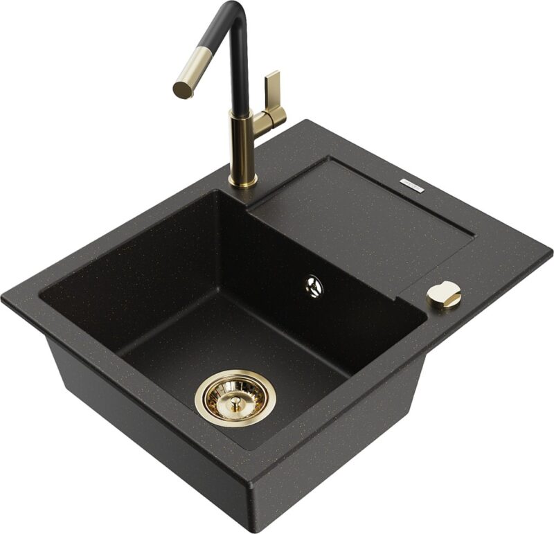Technické dáta: drez: Rozmer: 576x465x174mm Hĺbka komory: 164 mm Rozmery komory: 395×320 mm Priemer odtoku: ø90 mm Typ: 1-miska s krátkym odkvapkávačom Typ: Zapustené do pracovnej dosky Farba: čierna / zlatá metalíza Povrchová úprava sifónu: zlatá Materiál: žula (80% žulové kamenivo, 20% živice) Prepadový otvor: Áno Otvory: (batérie, automatické) 2 Inštalácia: Univerzálna, je možné inštalovať s odkvapkávačom na ľavú alebo pravú stranu Vysoká odolnosť proti poškriabaniu a zmene farby Odolnosť proti tepelným šokom Ľahko čistiteľný povrch Dva dodatočné vyfrézované otvory na samodierovanie ø35 kuchynská batéria: Materiál: mosadz Farba: Zlatá/Čierna Hlava: Keramická Prevzdušňovač: Áno Typ: Jedna páka Rozsah výtoku: 245 mm Výška batérie: 307 mm(GT) Ean: 5905315058768