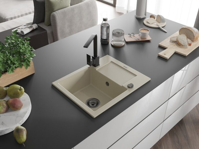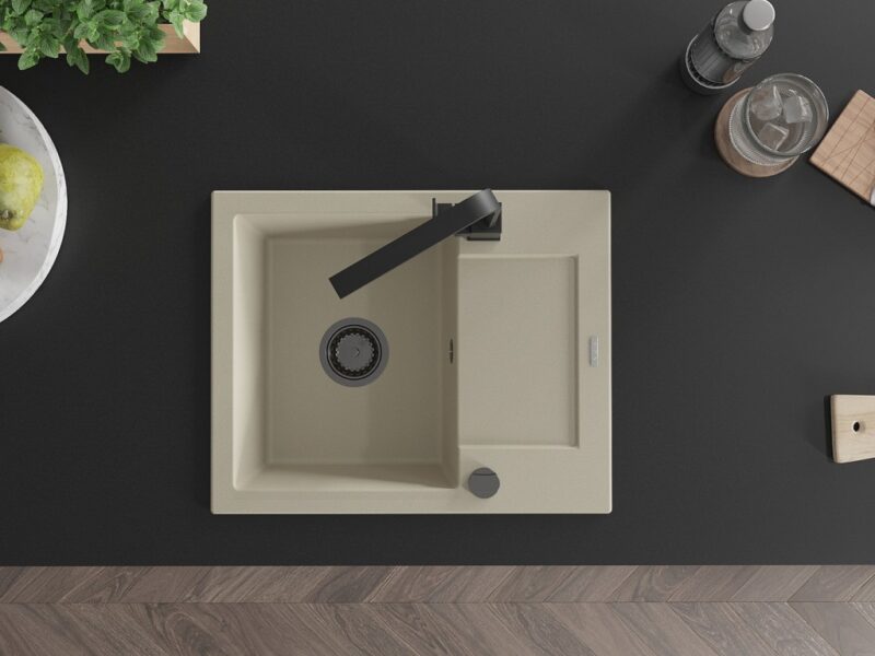 Technické dáta: drez: Rozmer: 576x465x174mm Hĺbka komory: 164 mm Rozmery komory: 395×320 mm Priemer odtoku: ø90 mm Typ: 1-miska s krátkym odkvapkávačom Typ: Zapustené do pracovnej dosky Farba béžová Povrchová úprava sifónu: čierna Materiál: žula (80% žulové kamenivo, 20% živice) Prepadový otvor: Áno Otvory: (batérie, automatické) 2 Inštalácia: Univerzálna, je možné inštalovať s odkvapkávačom na ľavú alebo pravú stranu Vysoká odolnosť proti poškriabaniu a zmene farby Odolnosť proti tepelným šokom Ľahko čistiteľný povrch Dva dodatočné vyfrézované otvory na samodierovanie ø35 kuchynská batéria: Materiál: mosadz Čierna farba Hlava: Keramická Prevzdušňovač: Áno Typ: Jedna páka Výška batérie: 290 mm Rozsah výtoku: 220 mm(GT) Ean: 5905315018564