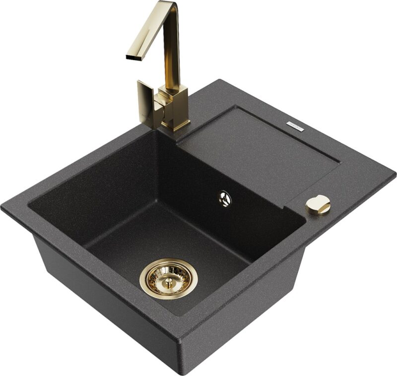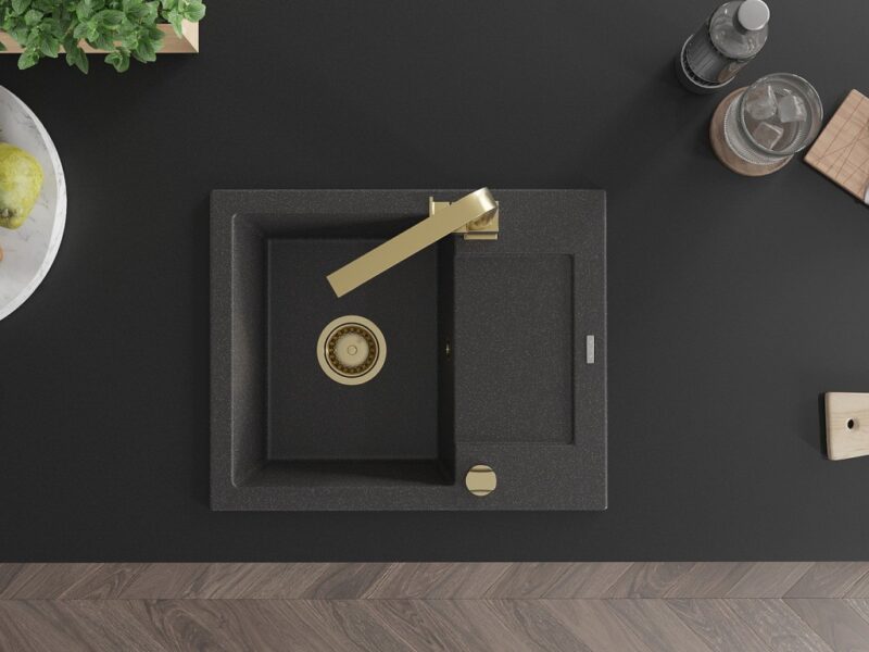 Technické dáta: drez: Rozmer: 576x465x174mm Hĺbka komory: 164 mm Rozmery komory: 395×320 mm Priemer odtoku: ø90 mm Typ: 1-miska s krátkym odkvapkávačom Typ: Zapustené do pracovnej dosky Farba: Škvrnitá čierna Povrchová úprava sifónu: zlatá Materiál: žula (80% žulové kamenivo, 20% živice) Prepadový otvor: Áno Otvory: (batérie, automatické) 2 Inštalácia: Univerzálna, je možné inštalovať s odkvapkávačom na ľavú alebo pravú stranu Vysoká odolnosť proti poškriabaniu a zmene farby Odolnosť proti tepelným šokom Ľahko čistiteľný povrch Dva dodatočné vyfrézované otvory na samodierovanie ø35 kuchynská batéria: Materiál: mosadz Farba: Zlatá Hlava: Keramická Prevzdušňovač: Áno Typ: Jedna páka Výška batérie: 290 mm Rozsah výtoku: 220 mm(GT) Ean: 5905315018724