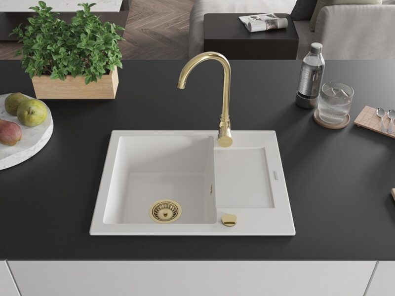 MEXEN/S MEXEN/S – Enzo granitový drez 1 s odkvapkávačom 576×465 mm, biela, + zlatý sifón 6506571005-20-G