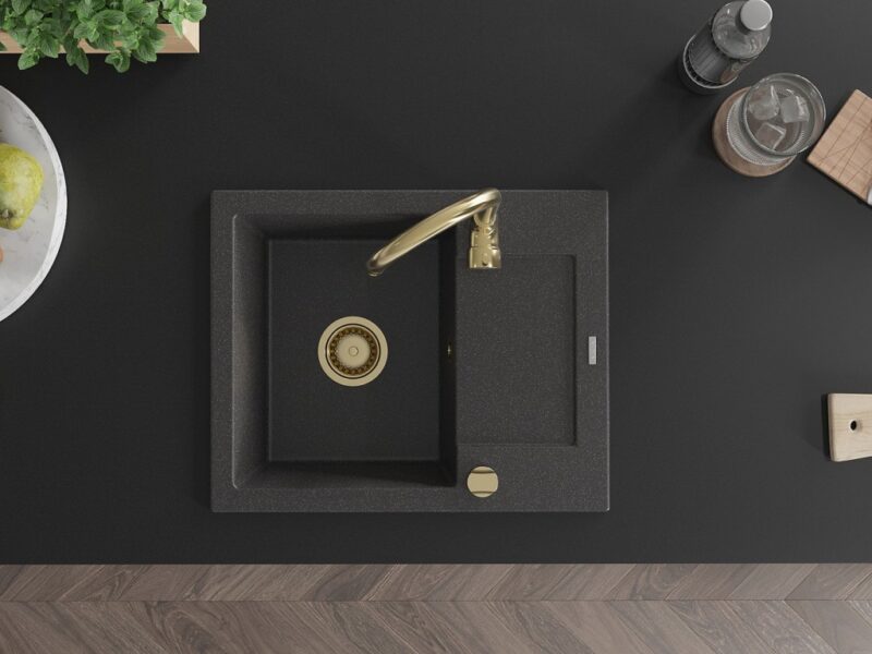 MEXEN/S MEXEN/S – Enzo granitový drez 1 s odkvapkávačom 576×465 mm, čierna kropenatá, + zlatý sifón 6506571005-76-G