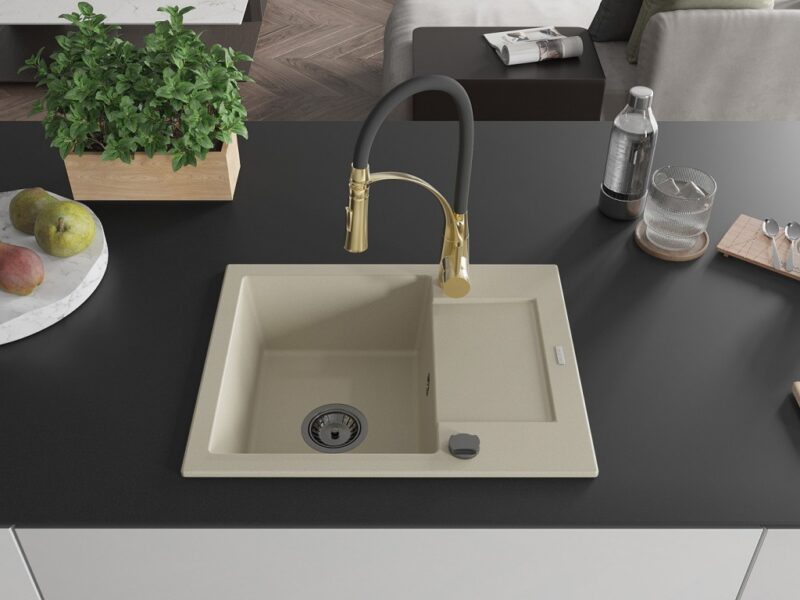 Technické dáta: drez: Rozmer: 576x465x174mm Hĺbka komory: 164 mm Rozmery komory: 395×320 mm Priemer odtoku: ø90 mm Typ: 1-miska s krátkym odkvapkávačom Typ: Zapustené do pracovnej dosky Farba béžová Povrchová úprava sifónu: čierna Materiál: žula (80% žulové kamenivo, 20% živice) Prepadový otvor: Áno Otvory: (batérie, automatické) 2 Inštalácia: Univerzálna, je možné inštalovať s odkvapkávačom na ľavú alebo pravú stranu Vysoká odolnosť proti poškriabaniu a zmene farby Odolnosť proti tepelným šokom Ľahko čistiteľný povrch Dva dodatočné vyfrézované otvory na samodierovanie ø35 kuchynská batéria: Materiál: mosadz Farba: Zlatá/Čierna Hlava: Keramická Prevzdušňovač: Áno Typ: Jedna páka Výška batérie: 430 mm Rozsah výtoku: 185 mm Batéria má výsuvný výtok(GT) Ean: 5905315044716