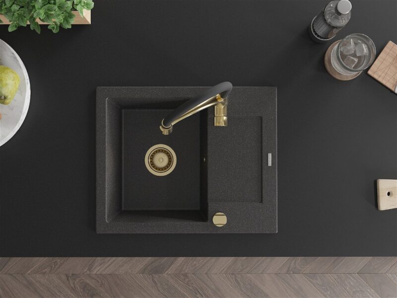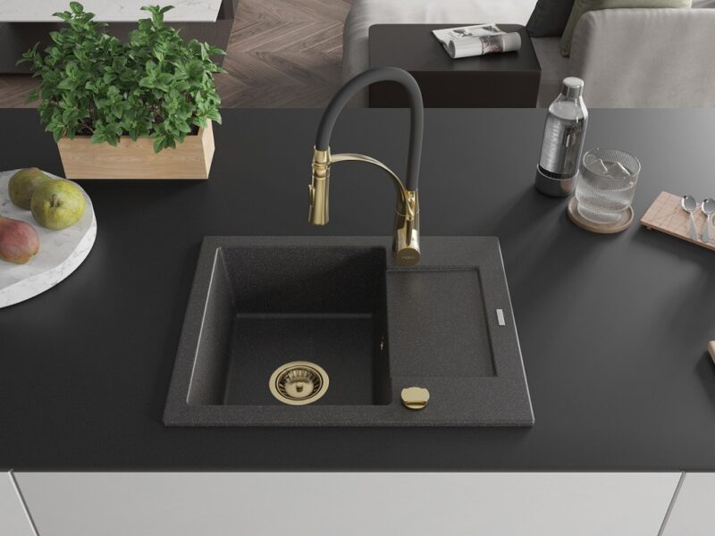 Technické dáta: drez: Rozmer: 576x465x174mm Hĺbka komory: 164 mm Rozmery komory: 395×320 mm Priemer odtoku: ø90 mm Typ: 1-miska s krátkym odkvapkávačom Typ: Zapustené do pracovnej dosky Farba: Škvrnitá čierna Povrchová úprava sifónu: zlatá Materiál: žula (80% žulové kamenivo, 20% živice) Prepadový otvor: Áno Otvory: (batérie, automatické) 2 Inštalácia: Univerzálna, je možné inštalovať s odkvapkávačom na ľavú alebo pravú stranu Vysoká odolnosť proti poškriabaniu a zmene farby Odolnosť proti tepelným šokom Ľahko čistiteľný povrch Dva dodatočné vyfrézované otvory na samodierovanie ø35 kuchynská batéria: Materiál: mosadz Farba: Zlatá/Čierna Hlava: Keramická Prevzdušňovač: Áno Typ: Jedna páka Výška batérie: 430 mm Rozsah výtoku: 185 mm Batéria má výsuvný výtok(GT) Ean: 5905315044945