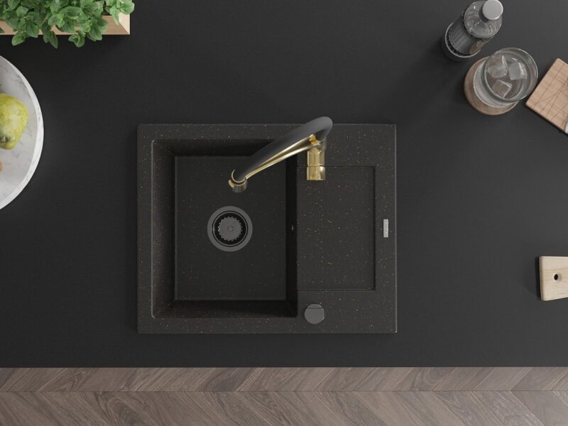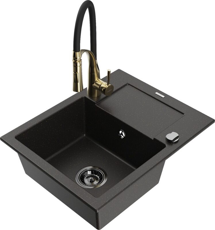 Technické dáta: drez: Rozmer: 576x465x174mm Hĺbka komory: 164 mm Rozmery komory: 395×320 mm Priemer odtoku: ø90 mm Typ: 1-miska s krátkym odkvapkávačom Typ: Zapustené do pracovnej dosky Farba: čierna / zlatá metalíza Povrchová úprava sifónu: čierna Materiál: žula (80% žulové kamenivo, 20% živice) Prepadový otvor: Áno Otvory: (batérie, automatické) 2 Inštalácia: Univerzálna, je možné inštalovať s odkvapkávačom na ľavú alebo pravú stranu Vysoká odolnosť proti poškriabaniu a zmene farby Odolnosť proti tepelným šokom Ľahko čistiteľný povrch Dva dodatočné vyfrézované otvory na samodierovanie ø35 kuchynská batéria: Materiál: mosadz Farba: Zlatá/Čierna Hlava: Keramická Prevzdušňovač: Áno Typ: Jedna páka Výška batérie: 430 mm Rozsah výtoku: 185 mm Batéria má výsuvný výtok(GT) Ean: 5905315044891