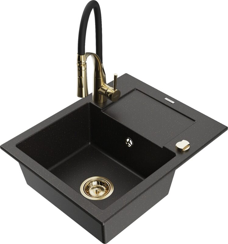 Technické dáta: drez: Rozmer: 576x465x174mm Hĺbka komory: 164 mm Rozmery komory: 395×320 mm Priemer odtoku: ø90 mm Typ: 1-miska s krátkym odkvapkávačom Typ: Zapustené do pracovnej dosky Farba: čierna / zlatá metalíza Povrchová úprava sifónu: zlatá Materiál: žula (80% žulové kamenivo, 20% živice) Prepadový otvor: Áno Otvory: (batérie, automatické) 2 Inštalácia: Univerzálna, je možné inštalovať s odkvapkávačom na ľavú alebo pravú stranu Vysoká odolnosť proti poškriabaniu a zmene farby Odolnosť proti tepelným šokom Ľahko čistiteľný povrch Dva dodatočné vyfrézované otvory na samodierovanie ø35 kuchynská batéria: Materiál: mosadz Farba: Zlatá/Čierna Hlava: Keramická Prevzdušňovač: Áno Typ: Jedna páka Výška batérie: 430 mm Rozsah výtoku: 185 mm Batéria má výsuvný výtok(GT) Ean: 5905315044884