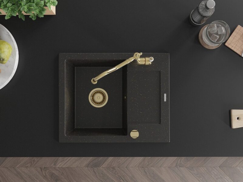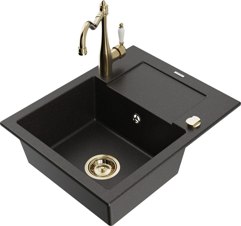 Technické dáta: drez: Rozmer: 576x465x174mm Hĺbka komory: 164 mm Rozmery komory: 395×320 mm Priemer odtoku: ø90 mm Typ: 1-miska s krátkym odkvapkávačom Typ: Zapustené do pracovnej dosky Farba: čierna / zlatá metalíza Povrchová úprava sifónu: zlatá Materiál: žula (80% žulové kamenivo, 20% živice) Prepadový otvor: Áno Otvory: (batérie, automatické) 2 Inštalácia: Univerzálna, je možné inštalovať s odkvapkávačom na ľavú alebo pravú stranu Vysoká odolnosť proti poškriabaniu a zmene farby Odolnosť proti tepelným šokom Ľahko čistiteľný povrch Dva dodatočné vyfrézované otvory na samodierovanie ø35 kuchynská batéria: Materiál: mosadz Farba: Zlatá Hlava: Keramická Prevzdušňovač: Áno Typ: Jedna páka Výška batérie: 290 mm Rozsah výtoku: 260 mm(GT) Ean: 5905315039163