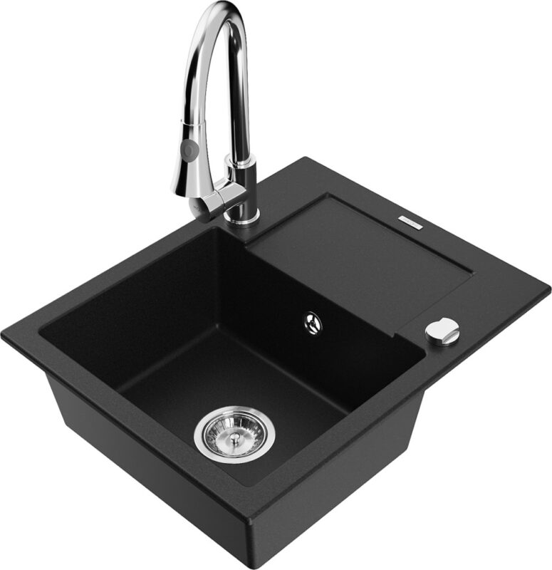 Technické dáta: drez: Rozmer: 576x465x174mm Hĺbka komory: 164 mm Rozmery komory: 395×320 mm Priemer odtoku: ø90 mm Typ: 1-miska s krátkym odkvapkávačom Typ: Zapustené do pracovnej dosky Čierna farba Povrchová úprava sifónu: Chrome Materiál: žula (80% žulové kamenivo, 20% živice) Prepadový otvor: Áno Otvory: (batérie, automatické) 2 Inštalácia: Univerzálna, je možné inštalovať s odkvapkávačom na ľavú alebo pravú stranu Vysoká odolnosť proti poškriabaniu a zmene farby Odolnosť proti tepelným šokom Ľahko čistiteľný povrch Dva dodatočné vyfrézované otvory na samodierovanie ø35 kuchynská batéria: Materiál: mosadz Farba: Chrome Hlava: Keramická Prevzdušňovač: Áno Typ: Jedna páka Výška batérie: 380 mm Rozsah výtoku: 252 mm Typ výtoku: Výsuvný(GT) Ean: 5905315029003