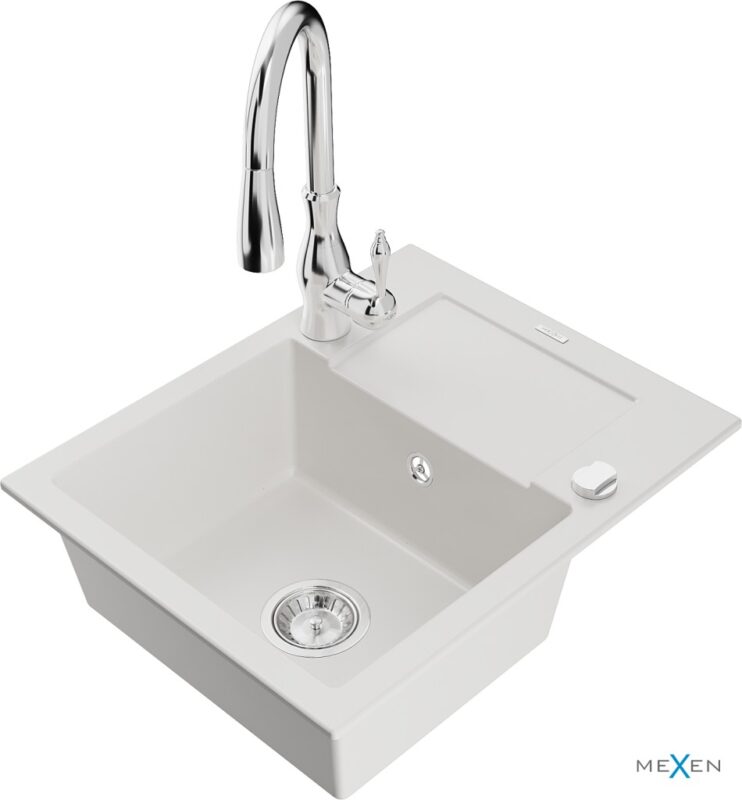 MEXEN/S MEXEN/S – Enzo granitový drez 1 s odkvapkávačom vrátane batérie Savita, biela 6506-20-672601-00