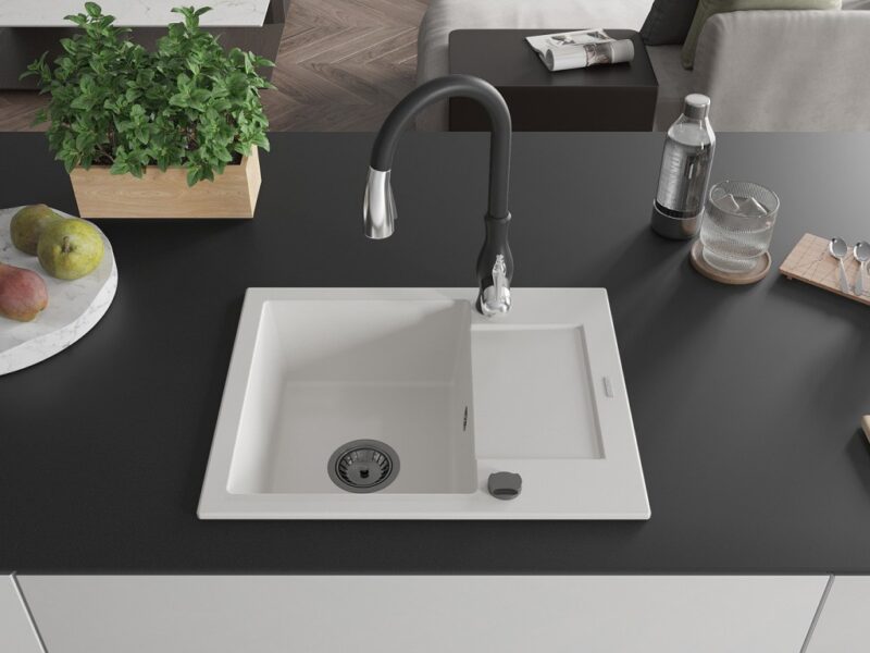 Technické dáta: drez: Rozmer: 576x465x174mm Hĺbka komory: 164 mm Rozmery komory: 395×320 mm Priemer odtoku: ø90 mm Typ: 1-miska s krátkym odkvapkávačom Typ: Zapustené do pracovnej dosky biela farba Povrchová úprava sifónu: čierna Materiál: žula (80% žulové kamenivo, 20% živice) Prepadový otvor: Áno Otvory: (batérie, automatické) 2 Inštalácia: Univerzálna, je možné inštalovať s odkvapkávačom na ľavú alebo pravú stranu Vysoká odolnosť proti poškriabaniu a zmene farby Odolnosť proti tepelným šokom Ľahko čistiteľný povrch Dva dodatočné vyfrézované otvory na samodierovanie ø35 kuchynská batéria: Materiál: mosadz Čierna farba Hlava: Keramická Prevzdušňovač: Áno Typ: Jedna páka Výška batérie: 410 mm Rozsah výtoku: 231 mm(GT) Ean: 5905315033888